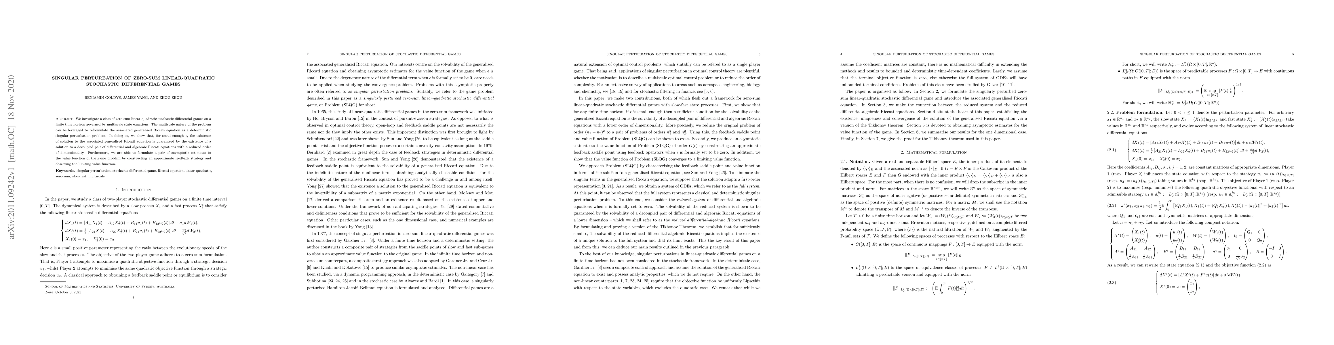 This paper explores zero-sum linear-quadratic stochastic differential games with multiscale state equations, reformulating the generalized Riccati equation as a singular perturbation problem. It demonstrates that for small perturbations, the solution exists through decoupled differential and algebraic Riccati equations, and provides asymptotic estimates for the game's value function.