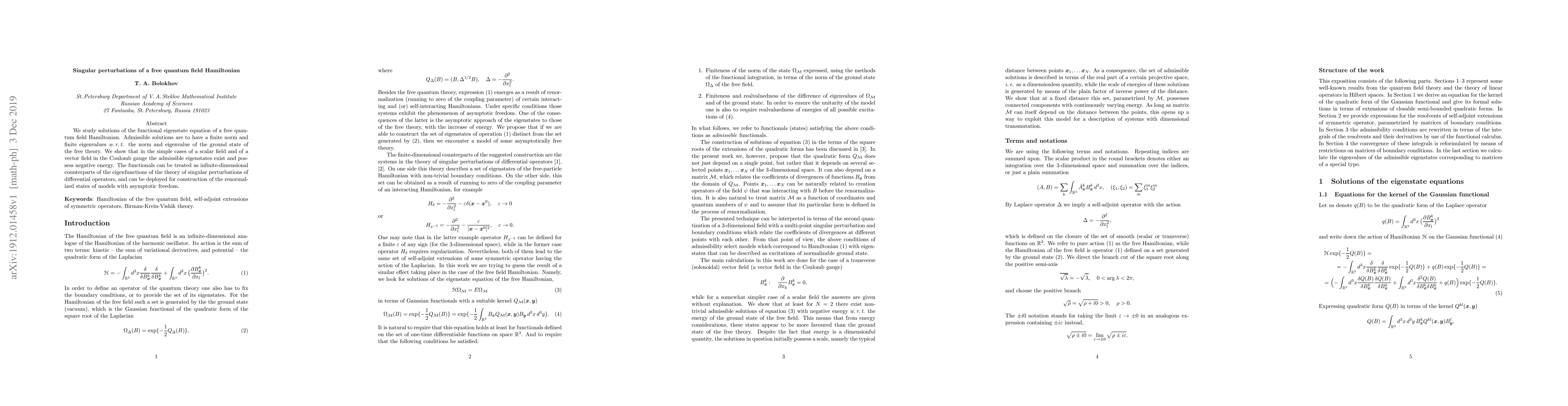 We study solutions of the functional eigenstate equation of a free quantum field Hamiltonian. Admissible solutions are to have a finite norm and a finite eigenvalue w.r.t. the norm and eigenvalue of the ground state of the free theory. We show that in the simple cases of a scalar field and of a vector field in the Coulomb gauge the admissible eigenstates exist and possess negative energy. The functionals can be treated as infinite-dimensional counterparts of the eigenfunctions of the theory of singular perturbations of differential operators, and can be deployed for construction of the renormalized states of models with asymptotic freedom.