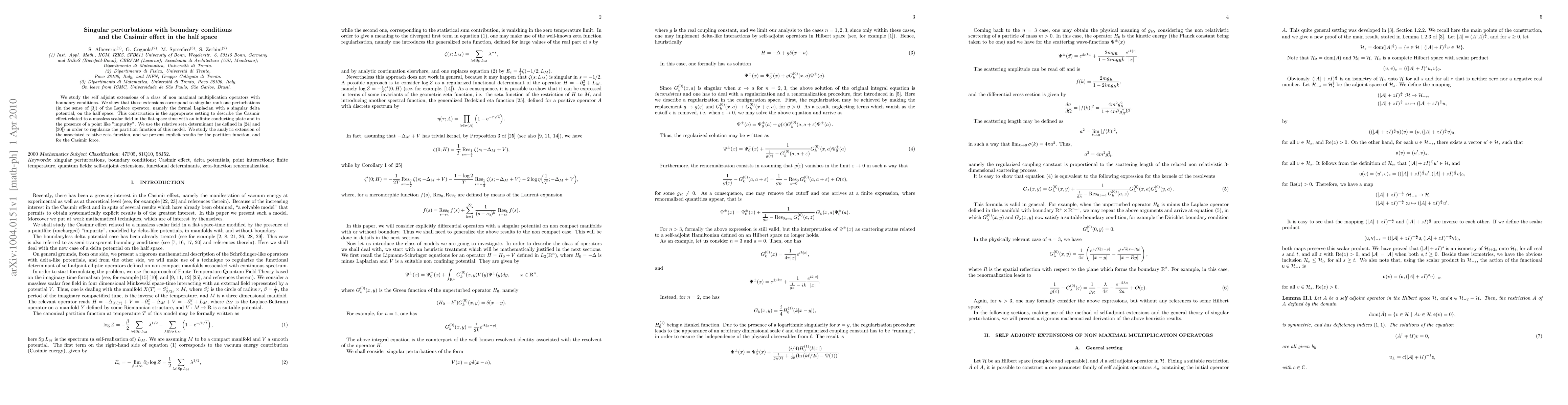 We study the self adjoint extensions of a class of non maximal multiplication operators with boundary conditions. We show that these extensions correspond to singular rank one perturbations (in the sense of \cite{AK}) of the Laplace operator, namely the formal Laplacian with a singular delta potential, on the half space. This construction is the appropriate setting to describe the Casimir effect related to a massless scalar field in the flat space time with an infinite conducting plate and in the presence of a point like "impurity". We use the relative zeta determinant (as defined in \cite{Mul} and \cite{SZ}) in order to regularize the partition function of this model. We study the analytic extension of the associated relative zeta function, and we present explicit results for the partition function, and for the Casimir force.