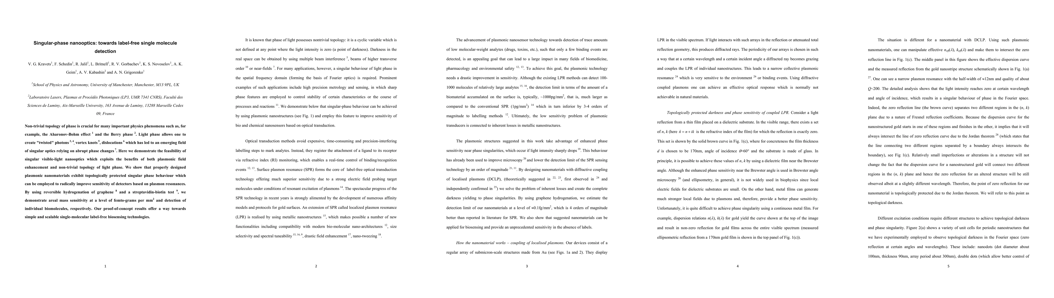 Non-trivial topology of phase is crucial for many important physics phenomena such as, for example, the Aharonov-Bohm effect 1 and the Berry phase 2. Light phase allows one to create "twisted" photons 3, 4 , vortex knots 5, dislocations 6 which has led to an emerging field of singular optics relying on abrupt phase changes 7. Here we demonstrate the feasibility of singular visible-light nanooptics which exploits the benefits of both plasmonic field enhancement and non-trivial topology of light phase. We show that properly designed plasmonic nanomaterials exhibit topologically protected singular phase behaviour which can be employed to radically improve sensitivity of detectors based on plasmon resonances. By using reversible hydrogenation of graphene 8 and a streptavidin-biotin test 9, we demonstrate areal mass sensitivity at a level of femto-grams per mm2 and detection of individual biomolecules, respectively. Our proof-of-concept results offer a way towards simple and scalable single-molecular label-free biosensing technologies.