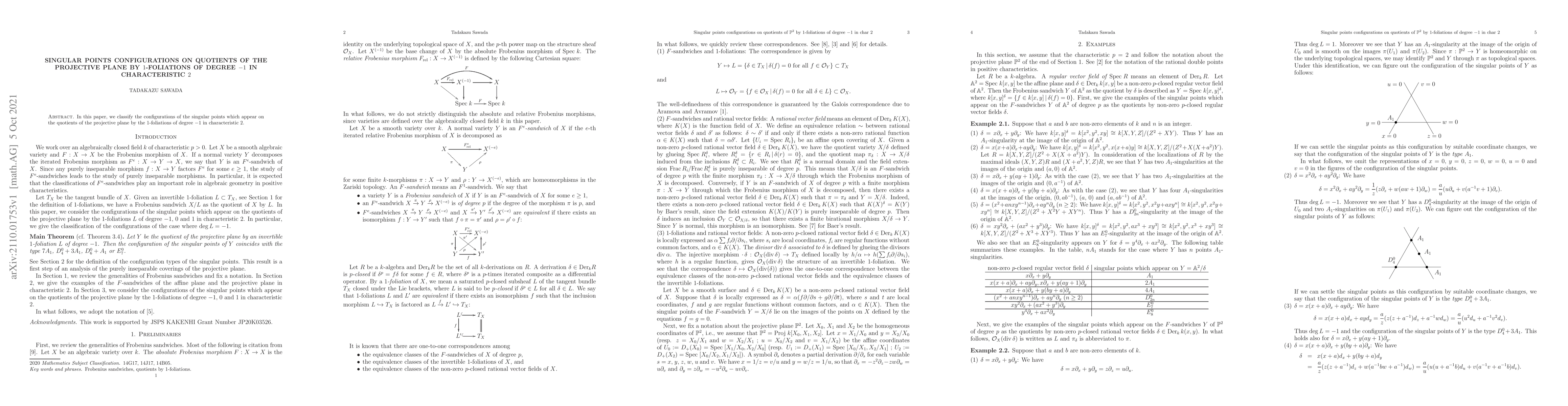 In this paper, we classify the configurations of the singular points which appear on the quotients of the projective plane by the $1$-foliations of degree $-1$ in characteristic $2$.