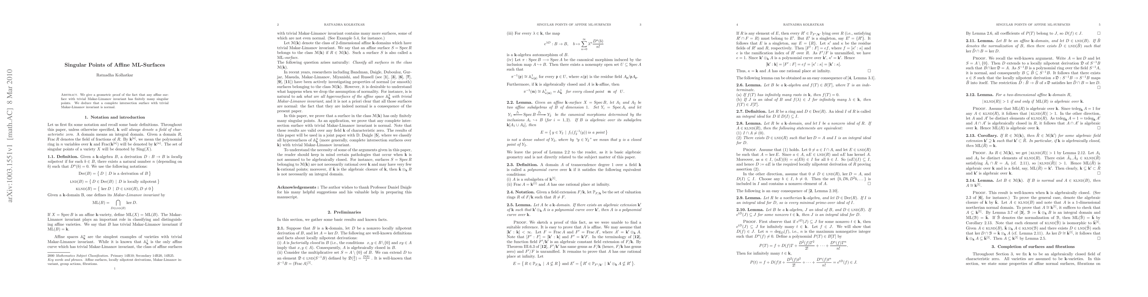 We give a geometric proof of the fact that any affine surface with trivial Makar-Limanov invariant has finitely many singular points. We deduce that a complete intersection surface with trivial Makar-Limanov invariant is normal.