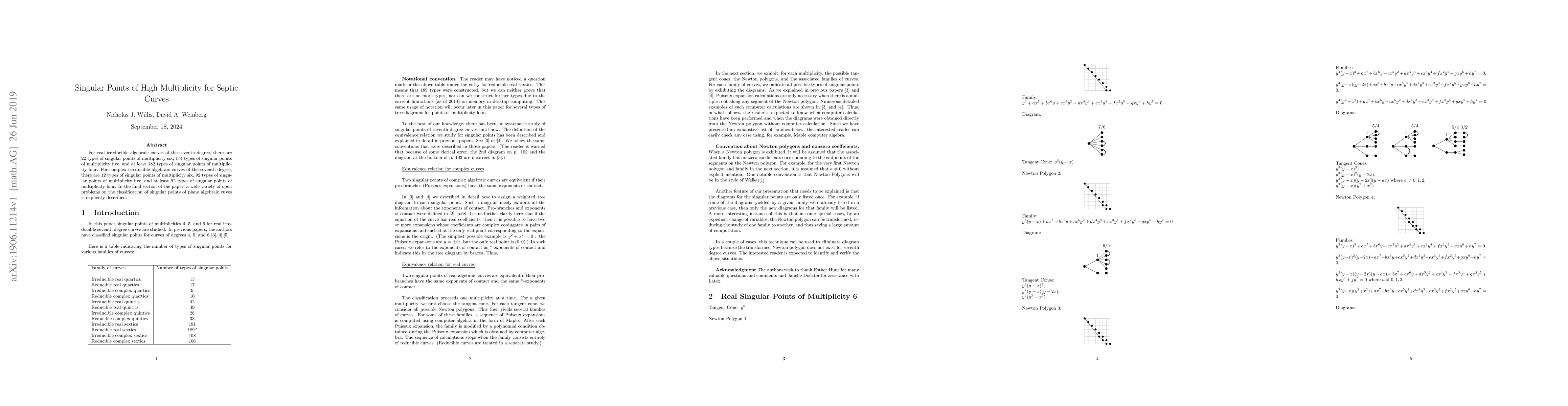 For real irreducible algebraic curves of the seventh degree, there are 22 types of singular points of multiplicity six, 174 types of singular points of multiplicity five, and at least 182 types of singular points of multiplicity four. For complex irreducible algebraic curves of the seventh degree, there are 12 types of singular points of multiplicity six, 92 types of singular points of multiplicity five, and at least 92 types of singular points of multiplicity four. In the final section of the paper, a wide variety of open problems on the classification of singular points of plane algebraic cuves is explicitly described.