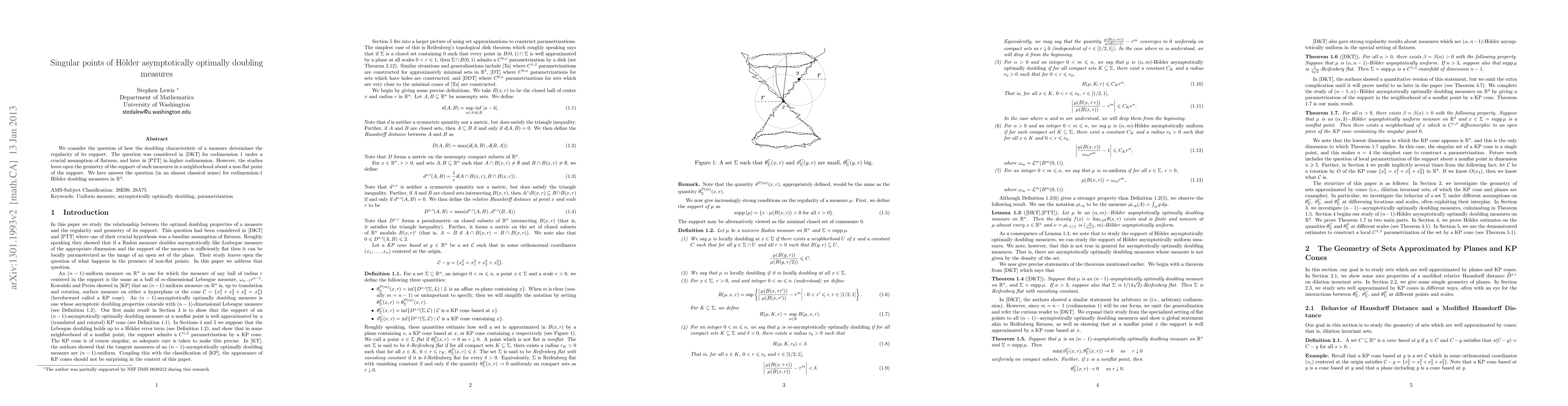 This paper answers a question about the geometry of H"older doubling measures in $ ilde{R}^4$, exploring how the measure's doubling characteristic affects its support near non-flat points.