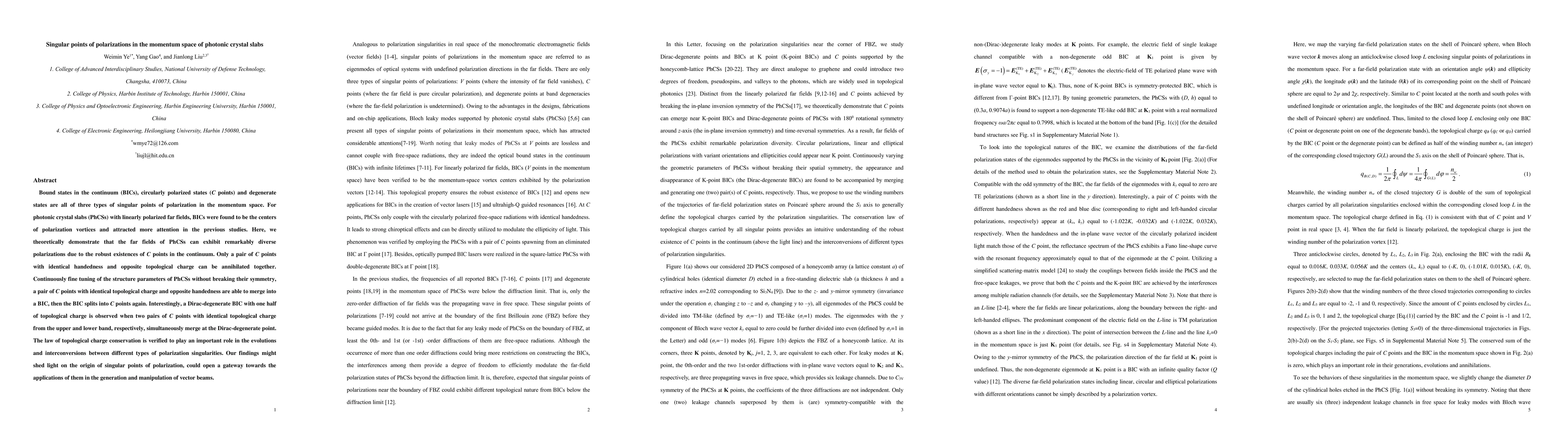 Bound states in the continuum (BICs), circularly polarized states (C points) and degenerate states are all of three types of singular points of polarization in the momentum space. For photonic crystal slabs (PhCSs) with linearly polarized far fields, BICs were found to be the centers of polarization vortices and attracted more attention in the previous studies. Here, we theoretically demonstrate that the far fields of PhCSs can exhibit remarkably diverse polarizations due to the robust existences of C points in the continuum. Only a pair of C points with identical handedness and opposite topological charge can be annihilated together. Continuously fine tuning of the structure parameters of PhCSs without breaking their symmetry, a pair of C points with identical topological charge and opposite handedness are able to merge into a BIC, then the BIC splits into C points again. Interestingly, a Dirac-degenerate BIC with one half of topological charge is observed when two pairs of C points with identical topological charge from the upper and lower band, respectively, simultaneously merge at the Dirac-degenerate point. The law of topological charge conservation is verified to play an important role in the evolutions and interconversions between different types of polarization singularities. Our findings might shed light on the origin of singular points of polarization, could open a gateway towards the applications of them in the generation and manipulation of vector beams.