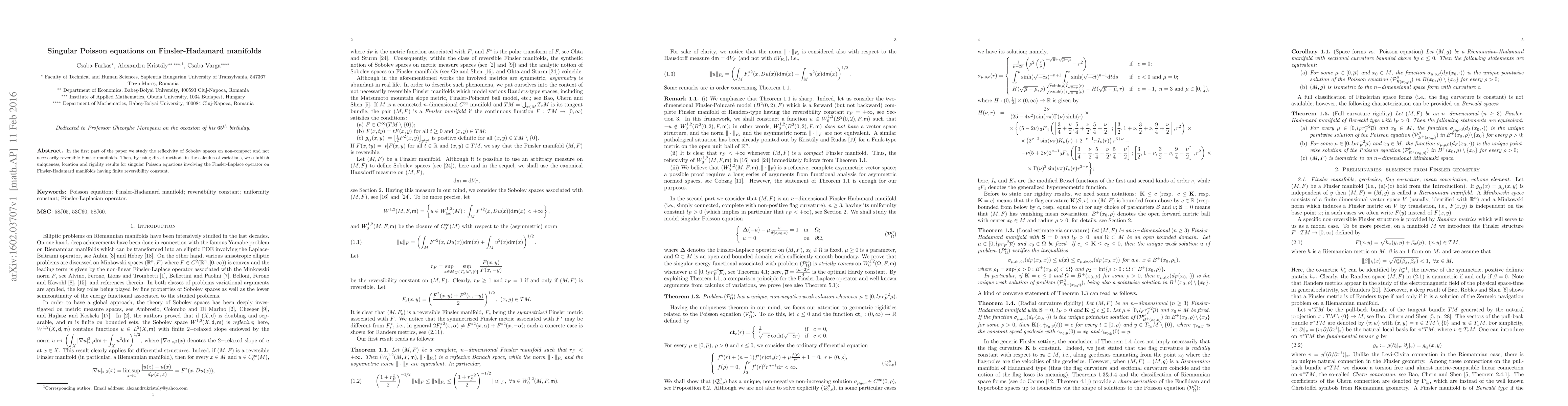 In the first part of the paper we study the reflexivity of Sobolev spaces on non-compact and not necessarily reversible Finsler manifolds. Then, by using direct methods in the calculus of variations, we establish uniqueness, location and rigidity results for singular Poisson equations involving the Finsler-Laplace operator on Finsler-Hadamard manifolds having finite reversibility constant.