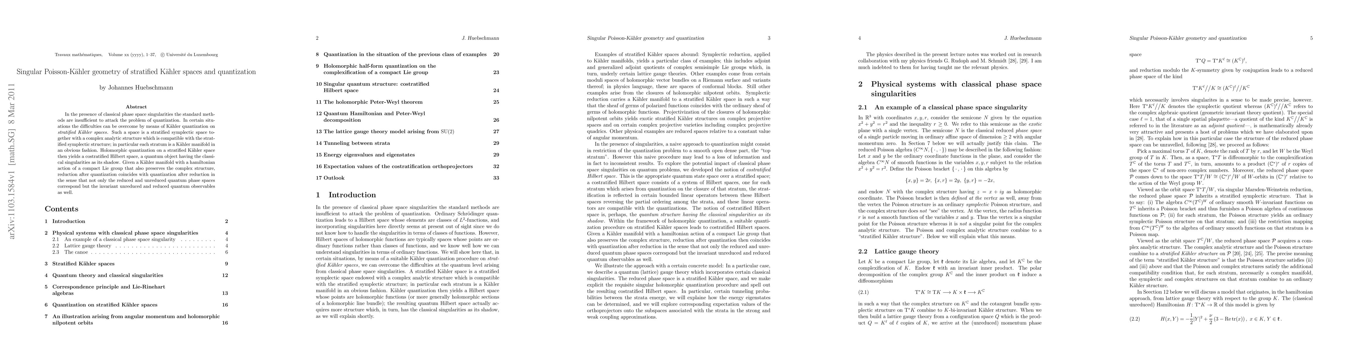 In the presence of classical phase space singularities the standard methods are insufficient to attack the problem of quantization.In certain situations the difficulties can be overcome by means of K\"ahler quantization on stratified K\"ahler spaces. Such a space is a stratified symplectic space together with a complex analytic structure which is compatible with the stratified symplectic structure; in particular each stratum is a K\"ahler manifold in an obvious fashion. Holomorphic quantization on a stratified K\"ahler space then yields a costratified Hilbert space, a quantum object having the classical singularities as its shadow. Given a K\"ahler manifold with a hamiltonian action of a compact Lie group that also preserves the complex structure, reduction after quantization coincides with quantization after reduction in the sense that not only the reduced and unreduced quantum phase spaces correspond but the invariant unreduced and reduced quantum observables as well