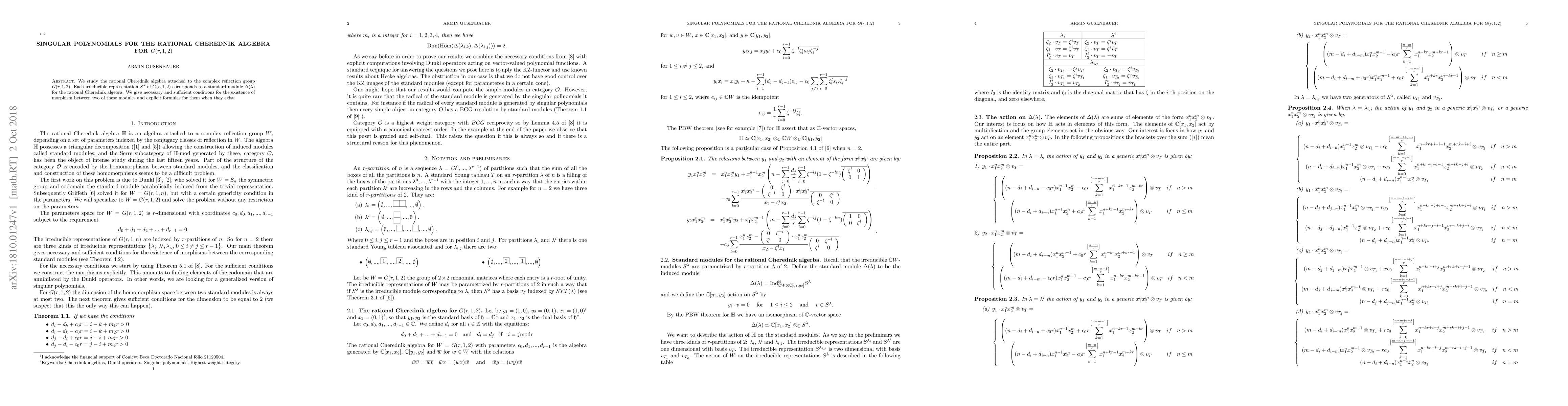 The paper investigates the rational Cherednik algebra related to the complex reflection group $G(r,1,2)$, presenting conditions for morphisms between its standard modules and providing explicit formulas for such morphisms when they exist.