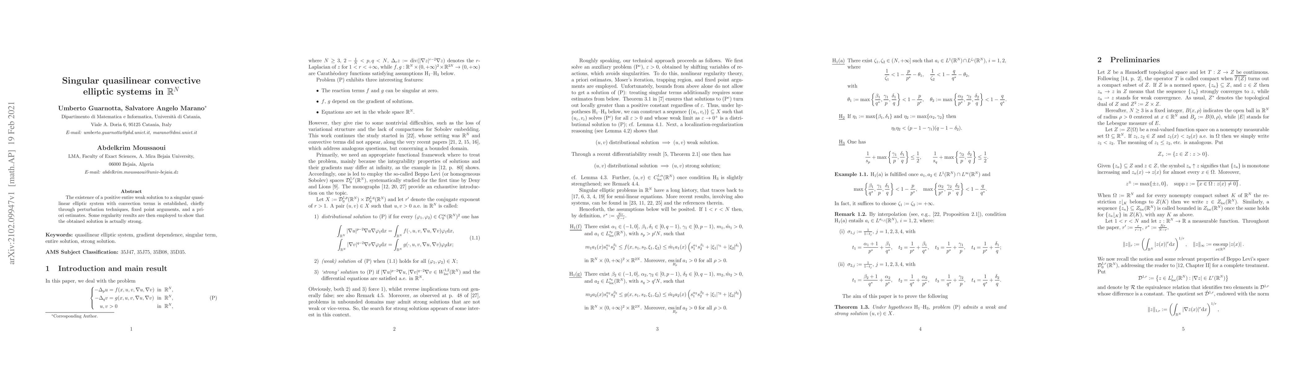 The existence of a positive entire weak solution to a singular quasi-linear elliptic system with convection terms is established, chiefly through perturbation techniques, fixed point arguments, and a priori estimates. Some regularity results are then employed to show that the obtained solution is actually strong.