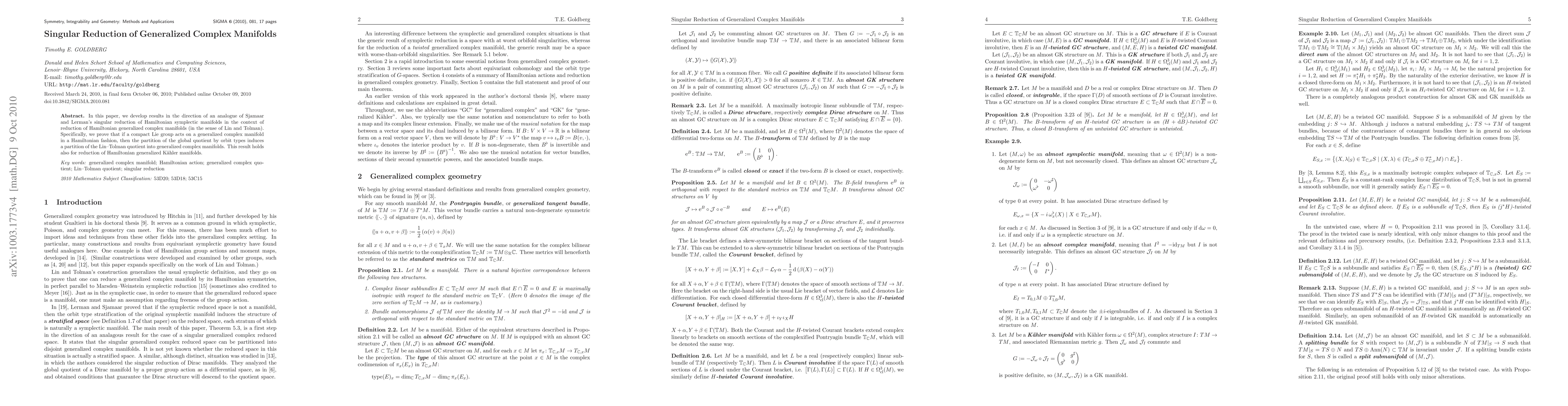 This paper extends the concept of singular reduction from Hamiltonian symplectic manifolds to generalized complex manifolds, proving that Hamiltonian actions on such manifolds yield quotients that are themselves generalized complex manifolds. The result also applies to Hamiltonian generalized Kähler manifolds.