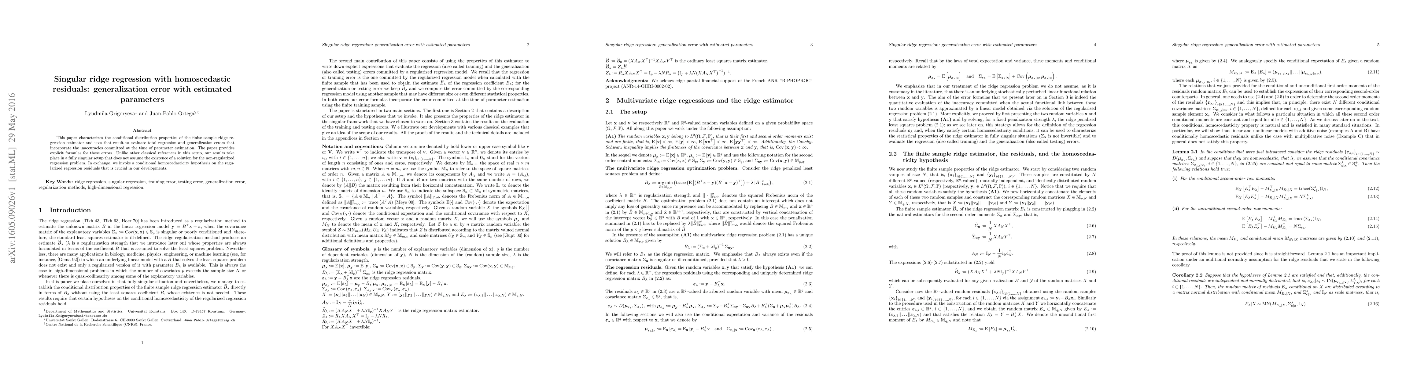 This paper characterizes the conditional distribution properties of the finite sample ridge regression estimator and uses that result to evaluate total regression and generalization errors that incorporate the inaccuracies committed at the time of parameter estimation. The paper provides explicit formulas for those errors. Unlike other classical references in this setup, our results take place in a fully singular setup that does not assume the existence of a solution for the non-regularized regression problem. In exchange, we invoke a conditional homoscedasticity hypothesis on the regularized regression residuals that is crucial in our developments.