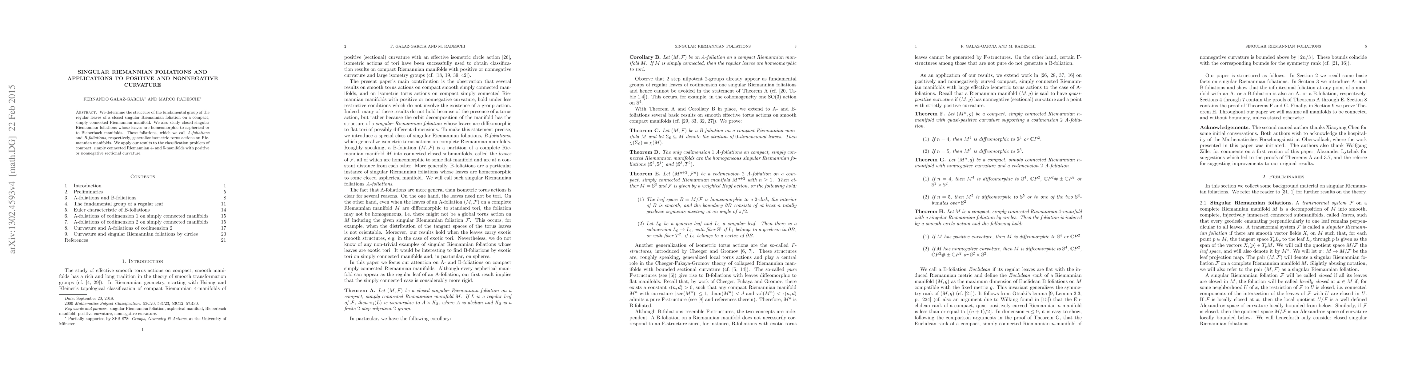 The paper investigates the fundamental group of regular leaves in closed singular Riemannian foliations on compact, simply connected manifolds and classifies these foliations based on their leaf structures. It applies these findings to classify 4- and 5-manifolds with positive or nonnegative sectional curvature.