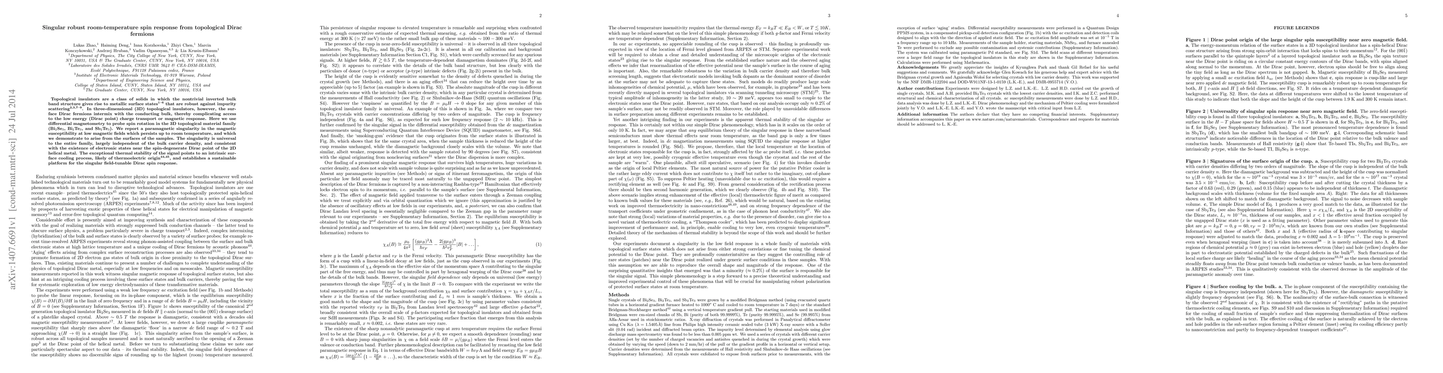 Topological insulators are a class of solids in which the nontrivial inverted bulk band structure gives rise to metallic surface states that are robust against impurity scattering. In three-dimensional (3D) topological insulators, however, the surface Dirac fermions intermix with the conducting bulk, thereby complicating access to the low energy (Dirac point) charge transport or magnetic response. Here we use differential magnetometry to probe spin rotation in the 3D topological material family (Bi$_2$Se$_3$, Bi$_2$Te$_3$, and Sb$_2$Te$_3$). We report a paramagnetic singularity in the magnetic susceptibility at low magnetic fields which persists up to room temperature, and which we demonstrate to arise from the surfaces of the samples. The singularity is universal to the entire family, largely independent of the bulk carrier density, and consistent with the existence of electronic states near the spin-degenerate Dirac point of the 2D helical metal. The exceptional thermal stability of the signal points to an intrinsic surface cooling process, likely of thermoelectric origin, and establishes a sustainable platform for the singular field-tunable Dirac spin response.