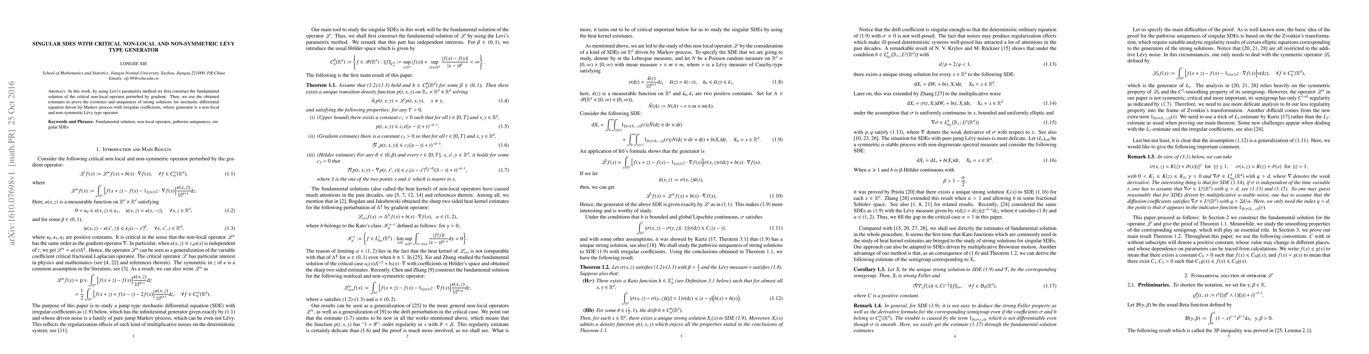 In this work, by using Levi's parametrix method we first construct the fundamental solution of the critical non-local operator perturbed by gradient. Then, we use the obtained estimates to prove the existence and uniqueness of strong solutions for stochastic differential equation driven by Markov process with irregular coefficients, whose generator is a non-local and non-symmetric L\'evy type operator.