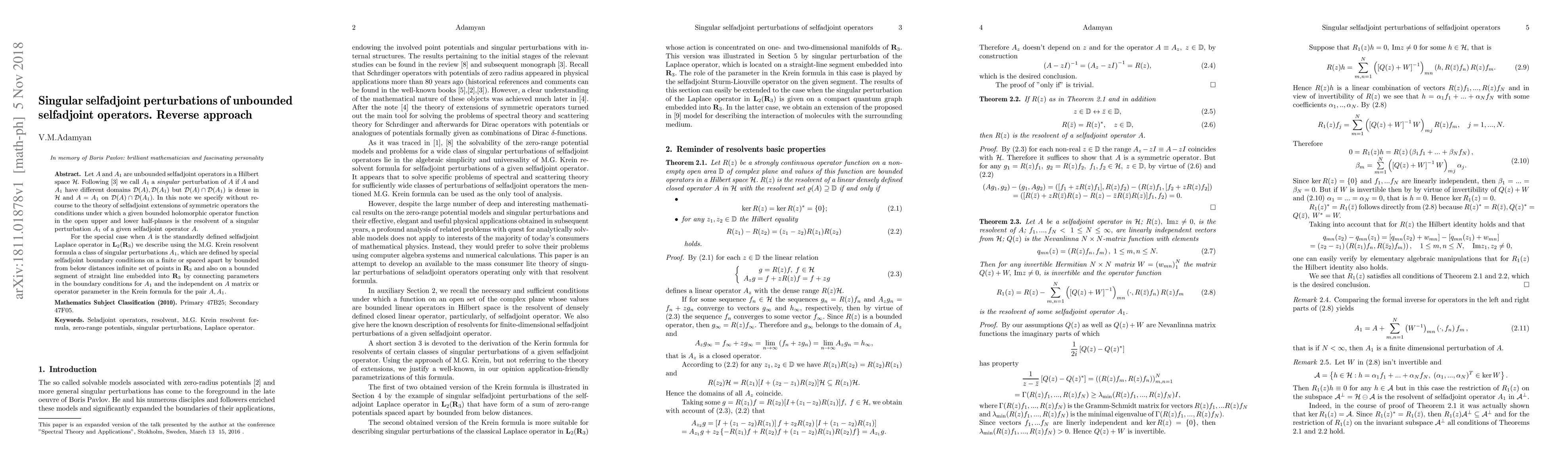 Let $A$ and $A_{1}$ are unbounded selfadjoint operators in a Hilbert space $\mathcal{H}$. Following \cite{AK} we call $A_{1}$ a \textit{singular} perturbation of $A$ if $A$ and $A_{1}$ have different domains $\mathcal{D}(A),\mathcal{D}(A_{1})$ but $\mathcal{D}(A)\cap\mathcal{D}(A_{1})$ is dense in $\mathcal{H}$ and $A=A_{1}$ on $\mathcal{D}(A)\cap\mathcal{D}(A_{1})$. In this note we specify without recourse to the theory of selfadjoint extensions of symmetric operators the conditions under which a given bounded holomorphic operator function in the open upper and lower half-planes is the resolvent of a singular perturbation $A_{1}$ of a given selfadjoint operator $A$. For the special case when $A$ is the standardly defined selfadjoint Laplace operator in $\mathbf{L}_{2}(\mathbf{R}_{3})$ we describe using the M.G. Krein resolvent formula a class of singular perturbations $A_{1}$, which are defined by special selfadjoint boundary conditions on a finite or spaced apart by bounded from below distances infinite set of points in $\mathbf{R}_{3}$ and also on a bounded segment of straight line embedded into $\mathbf{R}_{3}$ by connecting parameters in the boundary conditions for $A_{1}$ and the independent on $A$ matrix or operator parameter in the Krein formula for the pair $A, A_{1}$.