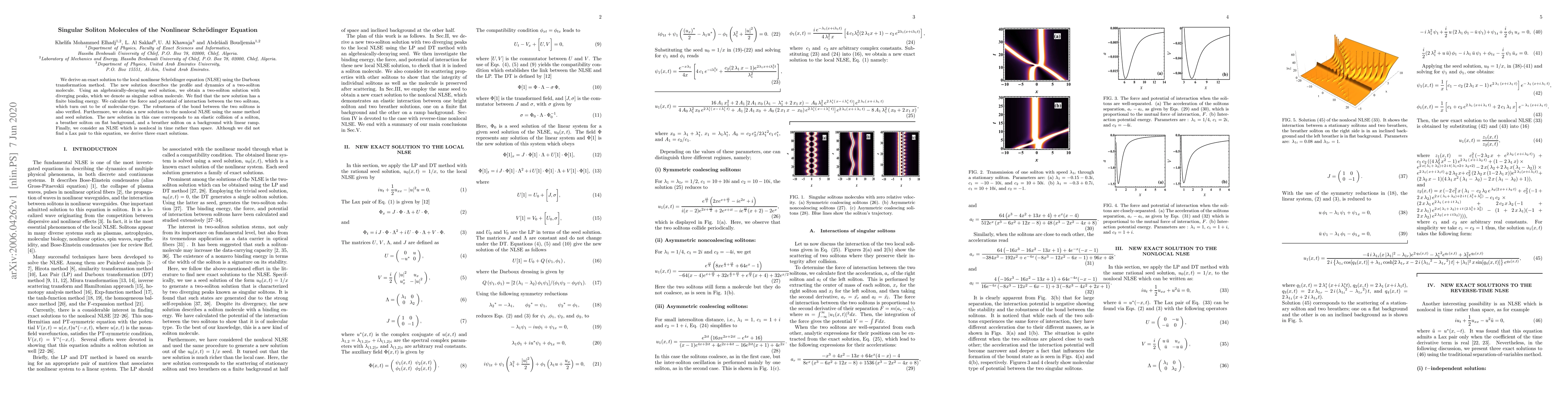 We derive an exact solution to the local nonlinear Schr\"odinger equation (NLSE) using the Darboux transformation method. The new solution describes the profile and dynamics of a two-soliton molecule. Using an algebraically-decaying seed solution, we obtain a two-soliton solution with diverging peaks, which we denote as singular soliton molecule. We find that the new solution has a finite binding energy. We calculate the force and potential of interaction between the two solitons, which turn out to be of molecular-type. The robustness of the bond between the two solitons is also verified. Furthermore, we obtain a new solution to the nonlocal NLSE using the same method and seed solution. The new solution in this case corresponds to an elastic collision of a soliton, a breather soliton on flat background, and a breather soliton on a background with linear ramp. Finally, we consider an NLSE which is nonlocal in time rather than space. Although we did not find a Lax pair to this equation, we derive three exact solutions.