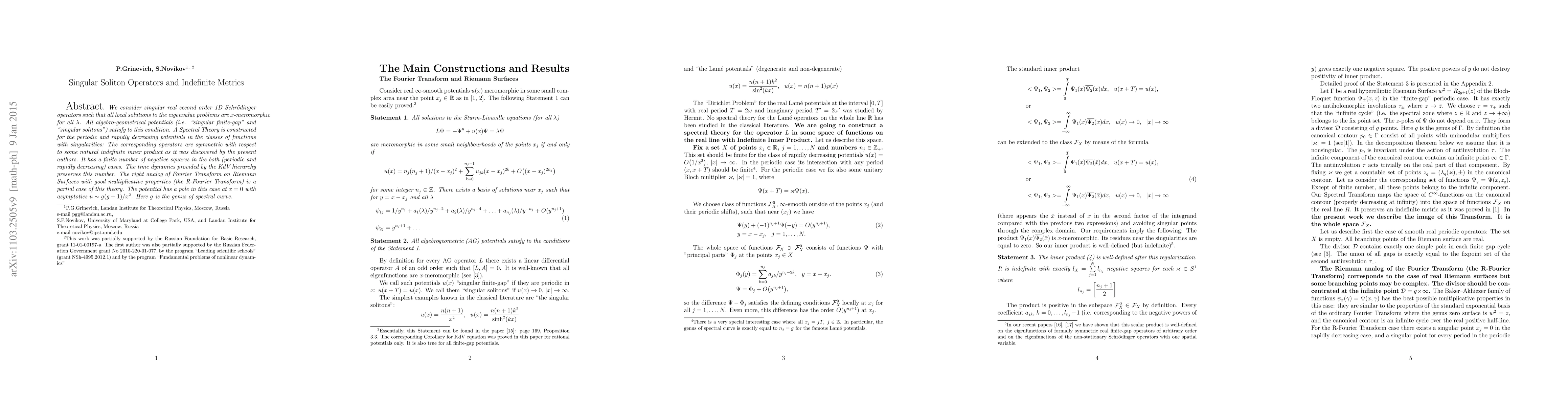 The singular real second order 1D Schrodinger operators are considered here with such potentials that all local solutions near singularities to the eigenvalue problem are meromorphic for all values of the spectral parameter. All algebro-geometrical or "singular finite-gap" potentials satisfy to this condition. A Spectral Theory is constructed here for the periodic and rapidly decreasing cases in the special classes of functions with singularities and indefinite inner product. It has a finite number of negative squares if the unimodular Bloch multipliers are fixed in the periodic case, and in the rapidly decreasing case. The time dynamics provided by the KdV hierarchy preserves this number. The right analog of Fourier Transform for the Riemann Surfaces preserving remarkable multiplicative properties of the ordinary (i.e. genus zero) Fourier Transform based on the standard exponential basis, leads to such operators as it was shown in our previous works.