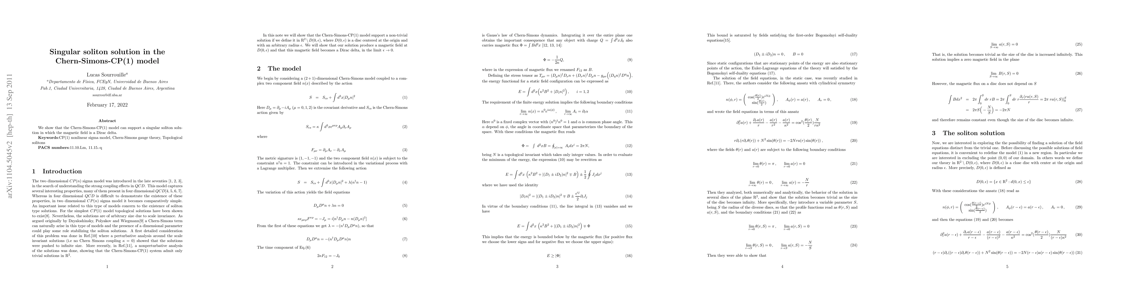 Summary: This study demonstrates the existence of a singular soliton solution in the Chern-Simons-CP(1) model, characterized by a magnetic field represented by a Dirac delta function. This finding highlights unique properties of soliton solutions within this theoretical framework.