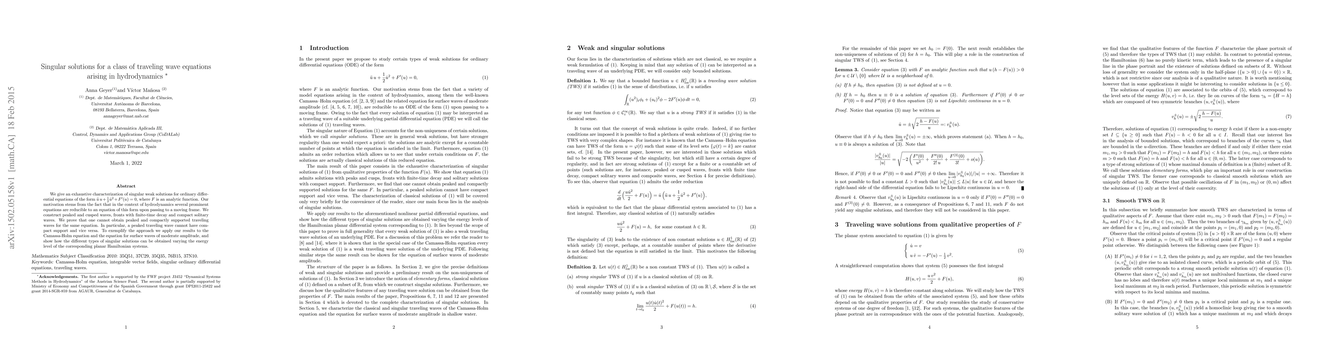 We give an exhaustive characterization of singular weak solutions for ordinary differential equations of the form $\ddot{u}\,u + \frac{1}{2}\dot{u}^2 + F'(u) =0$, where $F$ is an analytic function. Our motivation stems from the fact that in the context of hydrodynamics several prominent equations are reducible to an equation of this form upon passing to a moving frame. We construct peaked and cusped waves, fronts with finite-time decay and compact solitary waves. We prove that one cannot obtain peaked and compactly supported traveling waves for the same equation. In particular, a peaked traveling wave cannot have compact support and vice versa. To exemplify the approach we apply our results to the Camassa-Holm equation and the equation for surface waves of moderate amplitude, and show how the different types of singular solutions can be obtained varying the energy level of the corresponding planar Hamiltonian systems.
