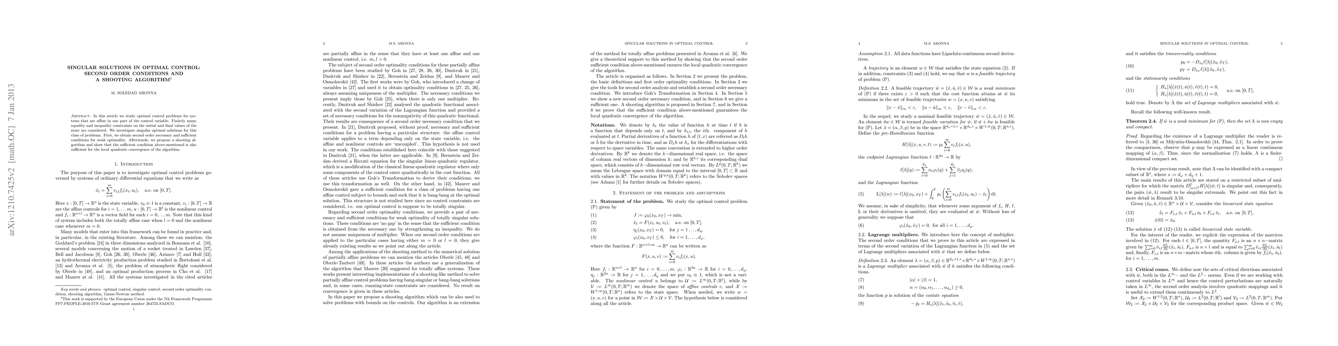 This paper examines optimal control problems with affine systems and singular solutions under constraints. It establishes second order conditions for weak optimality and introduces a shooting algorithm that demonstrates local quadratic convergence under the derived sufficient condition.