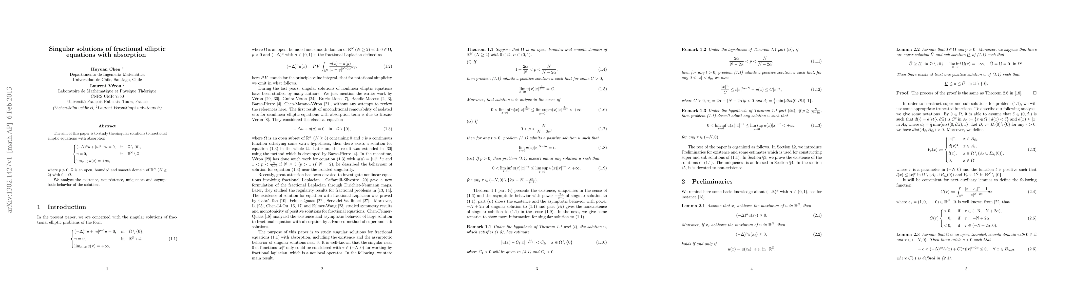 The aim of this paper is to study the singular solutions to fractional elliptic equations with absorption $$ \left\{\arraycolsep=1pt \begin{array}{lll} (-\Delta)^\alpha u+|u|^{p-1}u=0,\quad & \rm{in}\quad\Omega\setminus\{0\},\\[2mm] u=0,\quad & \rm{in}\quad \R^N\setminus\Omega,\\[2mm] \lim_{x\to 0}u(x)=+\infty, \end{array} \right. $$ where $p>0$, $\Omega$ is an open, bounded and smooth domain of $\R^N\ (N\ge2)$ with $0\in\Omega$. We analyze the existence, nonexistence, uniqueness and asymptotic behavior of the solutions.