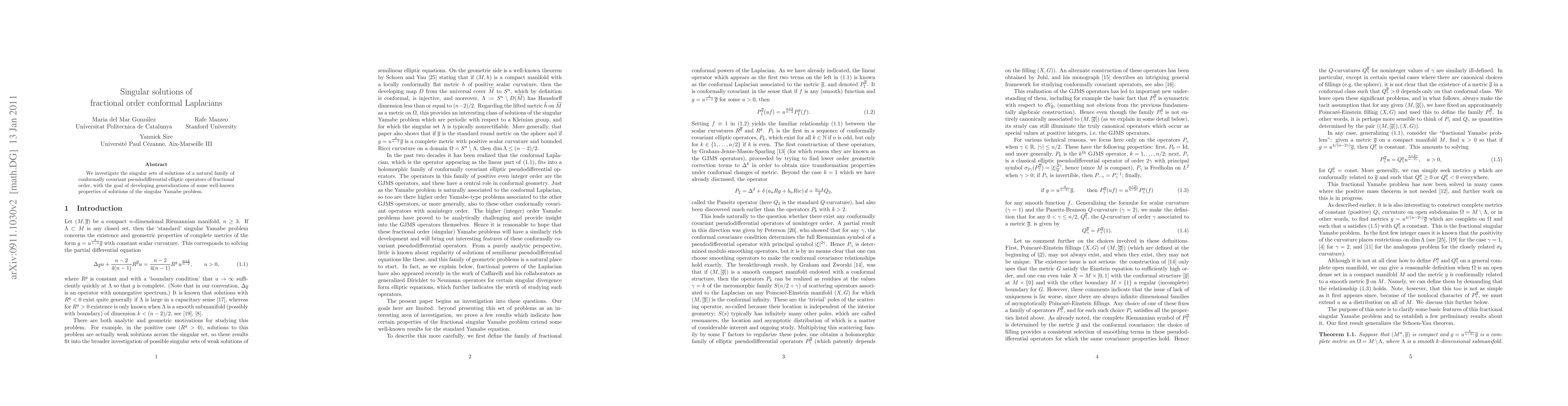 This paper explores the singular sets of solutions for fractional order conformal Laplacians, aiming to extend known properties from the singular Yamabe problem to these generalized elliptic operators.
