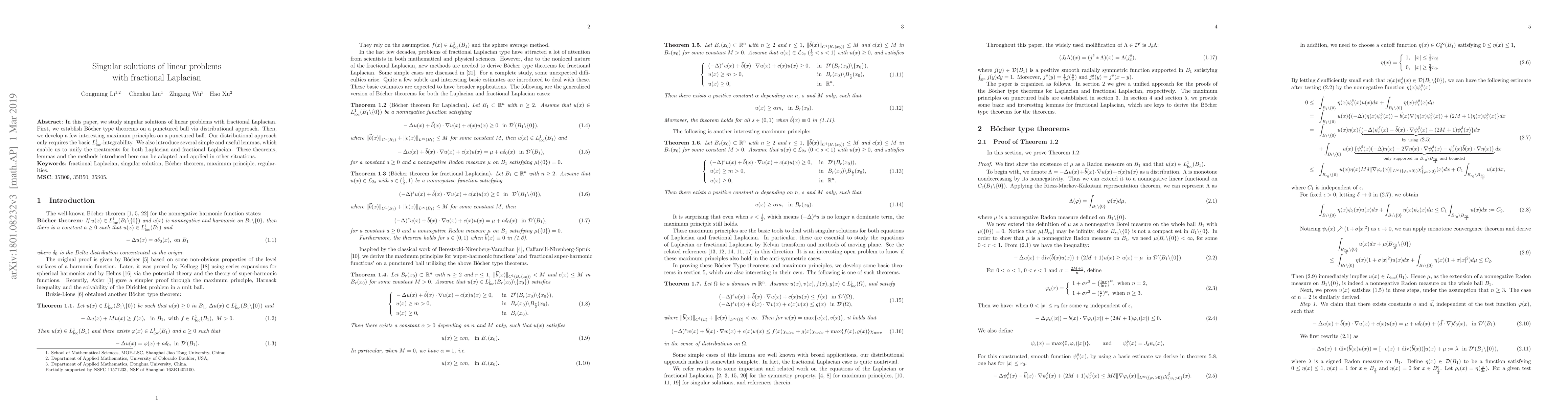 This paper explores singular solutions to linear problems involving the fractional Laplacian, establishing Bôcher type theorems and maximum principles on punctured balls using a distributional approach. The methods introduced require only local L¹ integrability and can be applied to both Laplacian and fractional Laplacian problems.