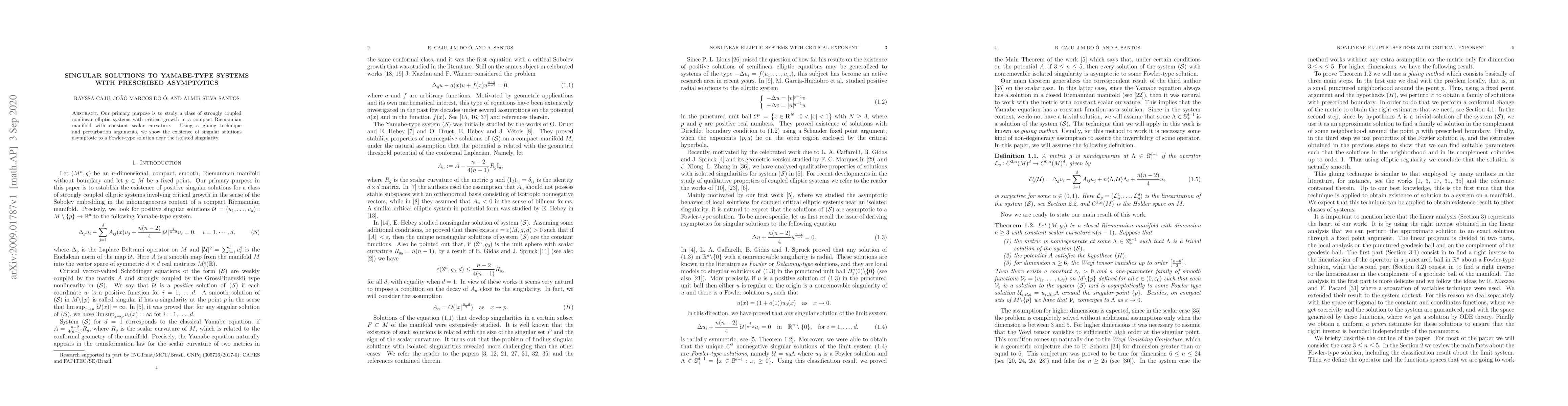 This paper proves the existence of singular solutions to nonlinear elliptic systems in compact manifolds with constant scalar curvature, which have critical growth and are asymptotic to a specific Fowler-type solution.