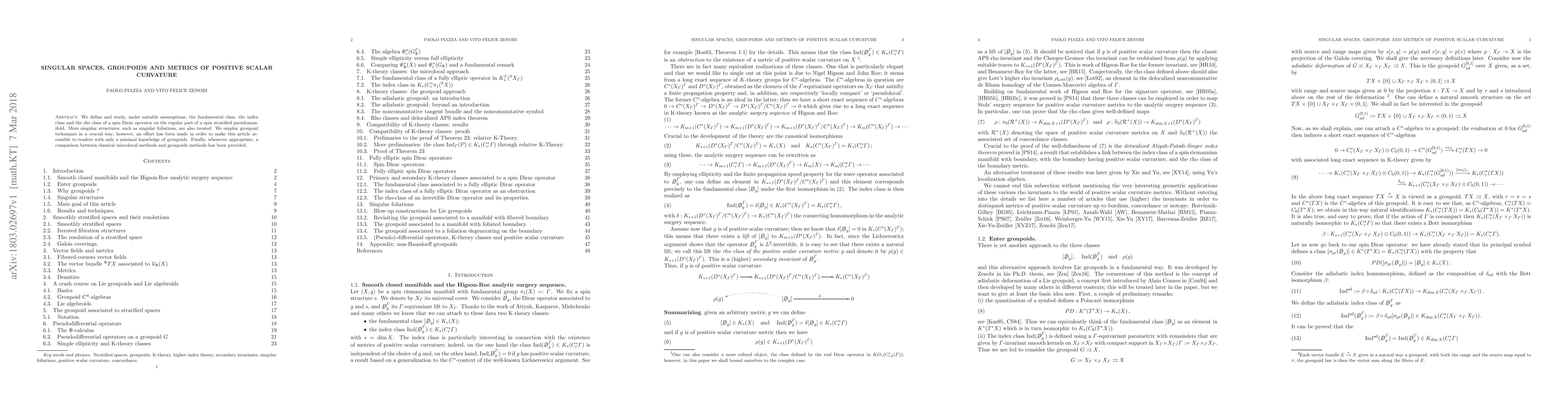 We define and study, under suitable assumptions, the fundamental class, the index class and the rho class of a spin Dirac operator on the regular part of a spin stratified pseudomanifold. More singular structures, such as singular foliations, are also treated. We employ groupoid techniques in a crucial way; however, an effort has been made in order to make this article accessible to readers with only a minimal knowledge of groupoids. Finally, whenever appropriate, a comparison between classical microlocal methods and groupoids methods has been provided.