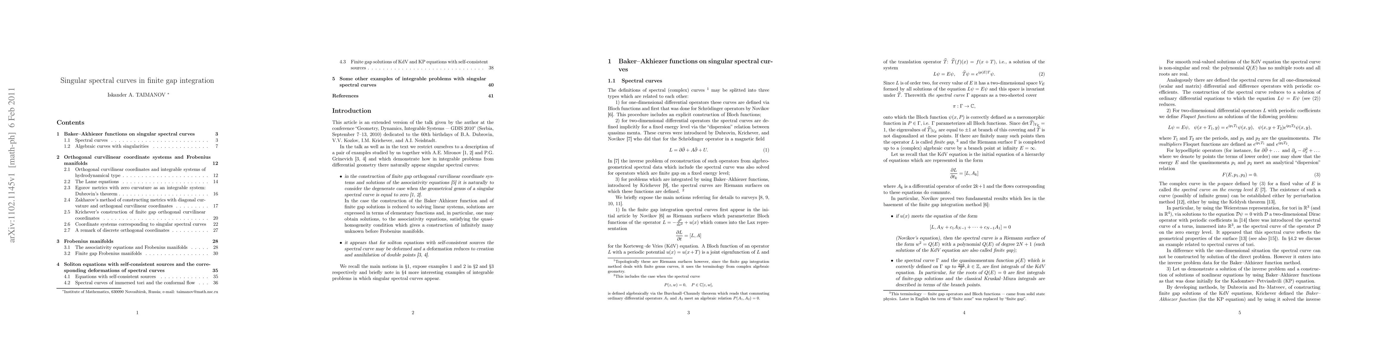 This paper explores applications of finite gap integration involving singular spectral curves, including orthogonal curvilinear coordinate systems, finite gap Frobenius manifolds, and soliton deformations of spectral curves with self-consistent sources. It extends a talk presented at the GDIS 2010 conference.
