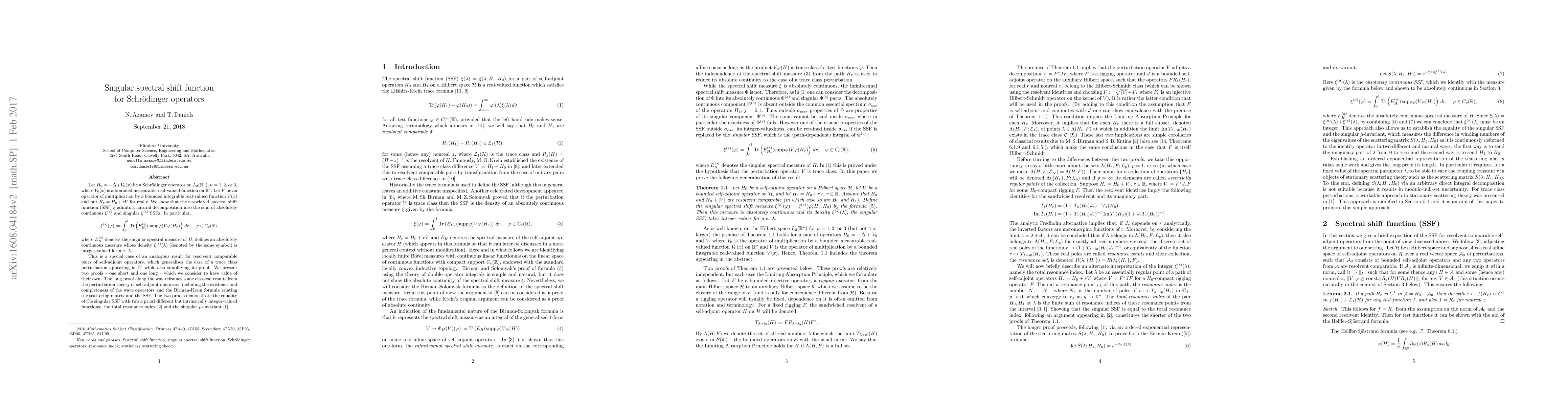 Let $H_0 = -\Delta + V_0(x)$ be a Schroedinger operator on $L_2(\mathbb{R}^\nu),$ $\nu=1,2,$ or 3, where $V_0(x)$ is a bounded measurable real-valued function on $\mathbb{R}^\nu.$ Let $V$ be an operator of multiplication by a bounded integrable real-valued function $V(x)$ and put $H_r = H_0+rV$ for real $r.$ We show that the associated spectral shift function (SSF) $\xi$ admits a natural decomposition into the sum of absolutely continuous $\xi^{(a)}$ and singular $\xi^{(s)}$ SSFs. This is a special case of an analogous result for resolvent comparable pairs of self-adjoint operators, which generalises the known case of a trace class perturbation while also simplifying its proof. We present two proofs -- one short and one long -- which we consider to have value of their own. The long proof along the way reframes some classical results from the perturbation theory of self-adjoint operators, including the existence and completeness of the wave operators and the Birman-Krein formula relating the scattering matrix and the SSF. The two proofs demonstrate the equality of the singular SSF with two a priori different but intrinsically integer-valued functions: the total resonance index and the singular $\mu$-invariant.