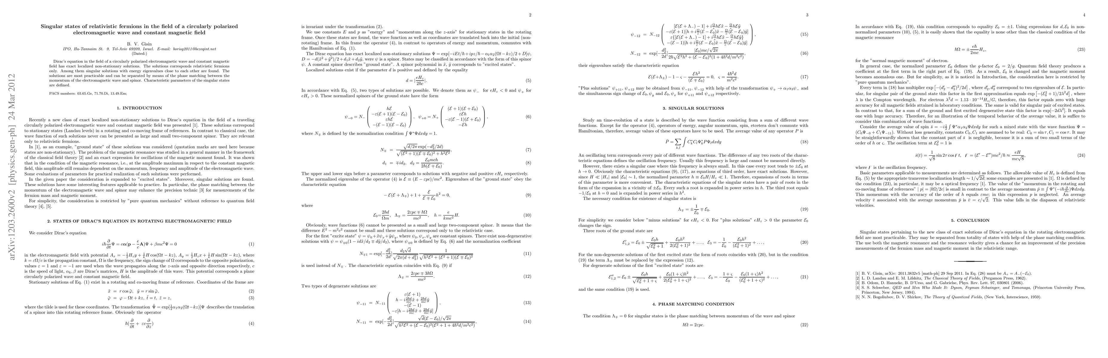 Dirac's equation in the field of a circularly polarized electromagnetic wave and constant magnetic field has exact localized non-stationary solutions. The solutions corresponds relativistic fermions only. Among them singular solutions with energy eigenvalues close to each other are found. The solutions are most practicable and can be separated by means of the phase matching between the momentum of the electromagnetic wave and spinor. Characteristic parameters of the singular states are defined.