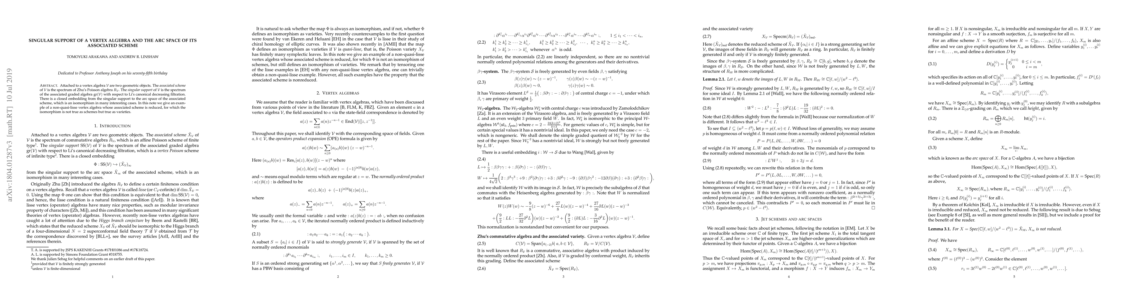 Attached to a vertex algebra $\mathcal{V}$ are two geometric objects. The associated scheme of $\mathcal{V}$ is the spectrum of Zhu's Poisson algebra $R_{\mathcal{V}}$. The singular support of $\mathcal{V}$ is the spectrum of the associated graded algebra $\text{gr}(\mathcal{V})$ with respect to Li's canonical decreasing filtration. There is a closed embedding from the singular support to the arc space of the associated scheme, which is an isomorphism in many interesting cases. In this note we give an example of a non-quasi-lisse vertex algebra whose associated scheme is reduced, for which the isomorphism is not true as schemes but true as varieties.