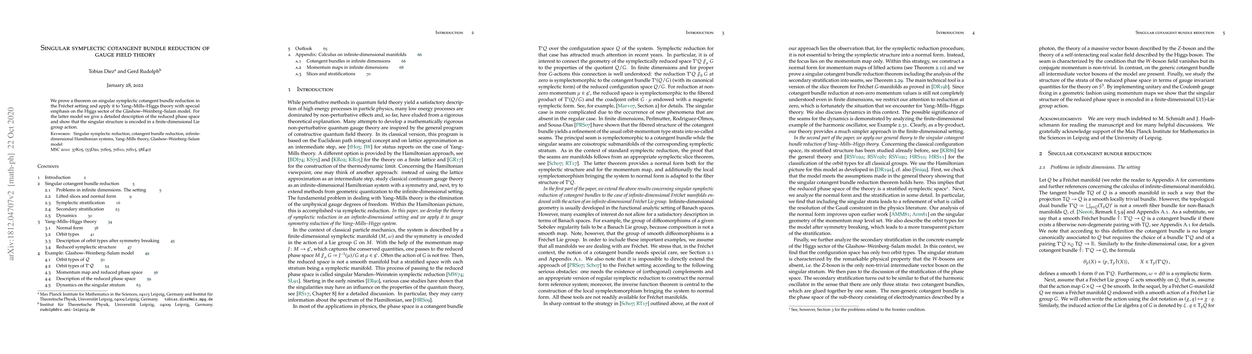 This paper proves a theorem on singular symplectic cotangent bundle reduction in a Fr\'echet setting and applies it to Yang-Mills-Higgs theory, particularly focusing on the Higgs sector of the Glashow-Weinberg-Salam model. It details the reduced phase space and demonstrates that the singular structure is represented by a finite-dimensional Lie group action.