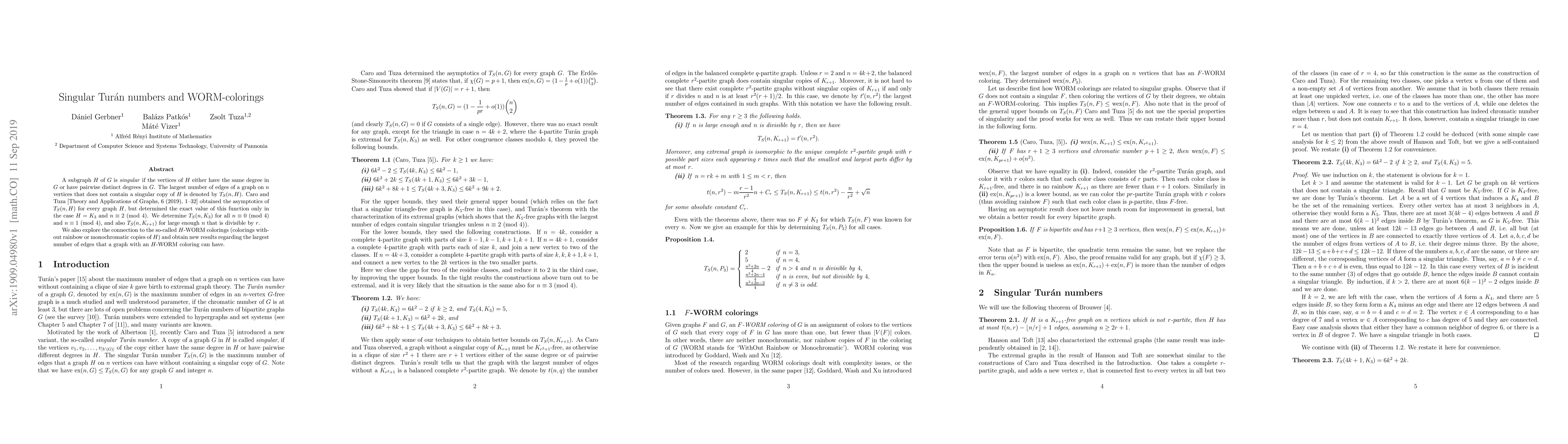 A subgraph $H$ of $G$ is \textit{singular} if the vertices of $H$ either have the same degree in $G$ or have pairwise distinct degrees in $G$. The largest number of edges of a graph on $n$ vertices that does not contain a singular copy of $H$ is denoted by $T_S(n,H)$. Caro and Tuza [Theory and Applications of Graphs, 6 (2019), 1--32] obtained the asymptotics of $T_S(n,H)$ for every graph $H$, but determined the exact value of this function only in the case $H=K_3$ and $n\equiv 2$ (mod 4). We determine $T_S(n,K_3)$ for all $n\equiv 0$ (mod 4) and $n\equiv 1$ (mod 4), and also $T_S(n,K_{r+1})$ for large enough $n$ that is divisible by $r$. We also explore the connection to the so-called $H$-WORM colorings (colorings without rainbow or monochromatic copies of $H$) and obtain new results regarding the largest number of edges that a graph with an $H$-WORM coloring can have.