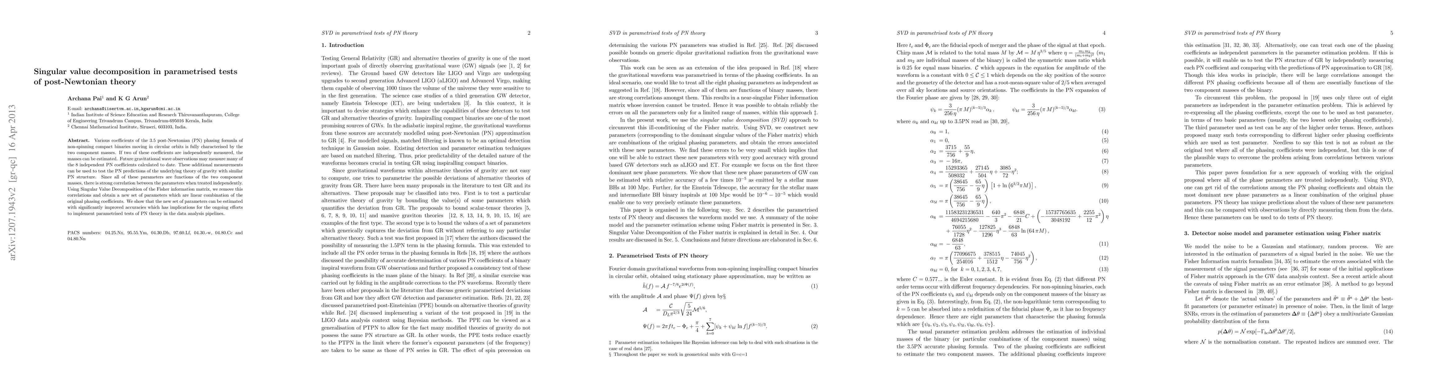 Researchers used Singular Value Decomposition to analyze 8 independent coefficients in post-Newtonian theory, removing correlations between them, which led to improved accuracy estimates for the underlying parameters.