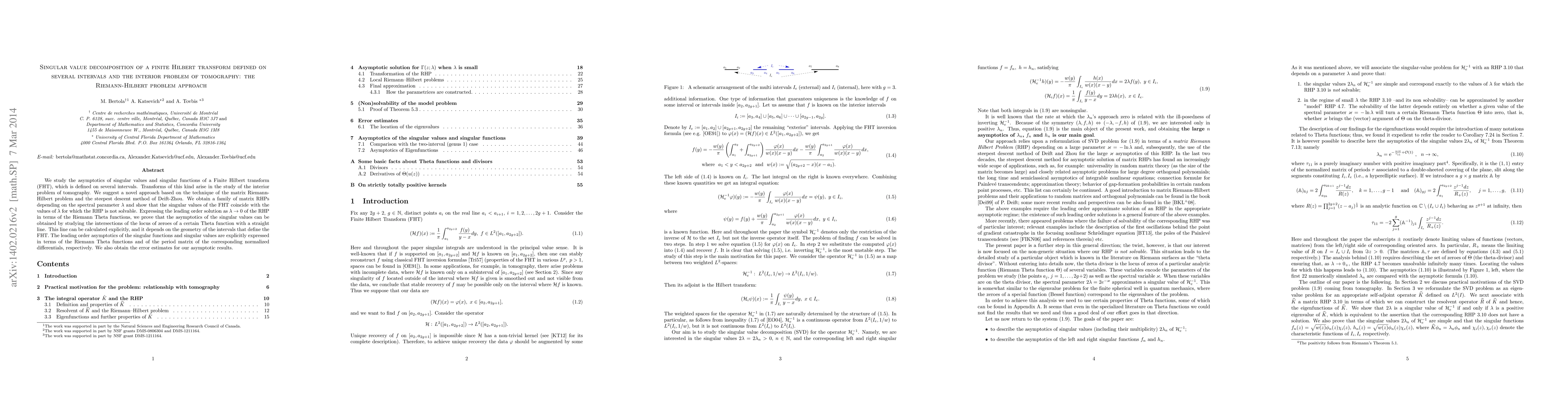 We study the asymptotics of singular values and singular functions of a Finite Hilbert transform (FHT), which is defined on several intervals. Transforms of this kind arise in the study of the interior problem of tomography. We suggest a novel approach based on the technique of the matrix Riemann-Hilbert problem and the steepest descent method of Deift-Zhou. We obtain a family of matrix RHPs depending on the spectral parameter $\lambda$ and show that the singular values of the FHT coincide with the values of $\lambda$ for which the RHP is not solvable. Expressing the leading order solution as $\lambda\to 0$ of the RHP in terms of the Riemann Theta functions, we prove that the asymptotics of the singular values can be obtained by studying the intersections of the locus of zeroes of a certain Theta function with a straight line. This line can be calculated explicitly, and it depends on the geometry of the intervals that define the FHT. The leading order asymptotics of the singular functions and singular values are explicitly expressed in terms of the Riemann Theta functions and of the period matrix of the corresponding normalized differentials, respectively. We also obtain the error estimates for our asymptotic results.