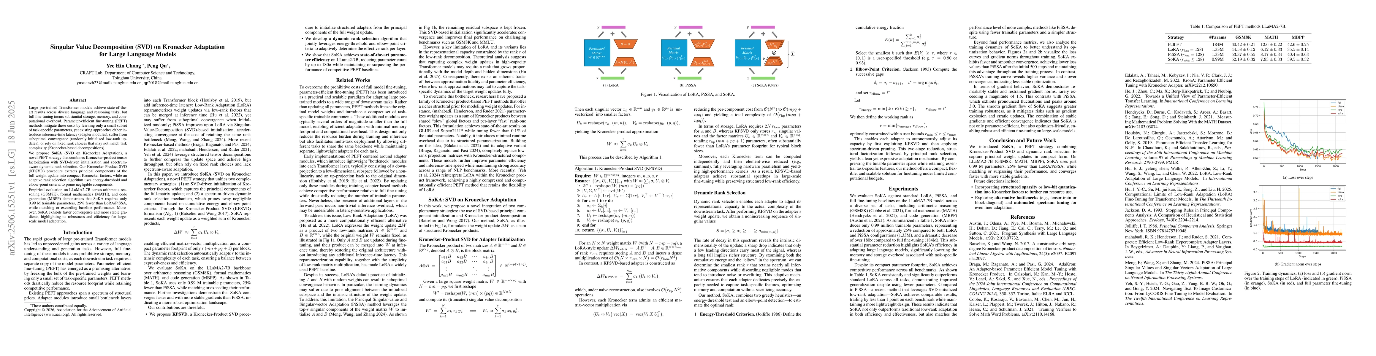Large pre-trained Transformer models achieve state-of-the-art results across diverse language and reasoning tasks, but full fine-tuning incurs substantial storage, memory, and computational overhead. Parameter-efficient fine-tuning (PEFT) methods mitigate these costs by learning only a small subset of task-specific parameters, yet existing approaches either introduce inference-time latency (adapter modules), suffer from suboptimal convergence (randomly initialized low-rank updates), or rely on fixed rank choices that may not match task complexity (Kronecker-based decompositions). We propose SoKA (SVD on Kronecker Adaptation), a novel PEFT strategy that combines Kronecker-product tensor factorization with SVD-driven initialization and spectrum-aware dynamic rank selection. Our Kronecker-Product SVD (KPSVD) procedure extracts principal components of the full weight update into compact Kronecker factors, while an adaptive rank selection algorithm uses energy-threshold and elbow-point criteria to prune negligible components. Empirical evaluation on LLaMA2-7B across arithmetic reasoning (GSM8K), formal mathematics (MATH), and code generation (MBPP) demonstrates that SoKA requires only 0.99M trainable parameters, 25% fewer than LoRA/PiSSA, while matching or exceeding baseline performance. Moreover, SoKA exhibits faster convergence and more stable gradients, highlighting its robustness and efficiency for large-scale model adaptation.