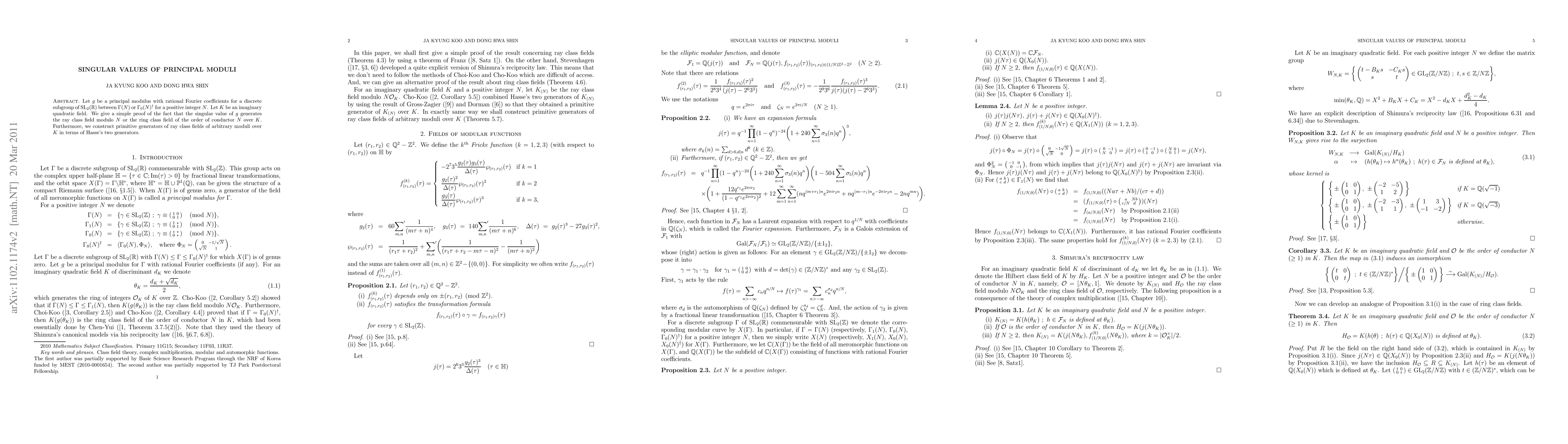 Let $g$ be a principal modulus with rational Fourier coefficients for a discrete subgroup of $\mathrm{SL}_2(\mathbb{R})$ between $\Gamma(N)$ or $\Gamma_0(N)^\dag$ for a positive integer $N$. Let $K$ be an imaginary quadratic field. We give a simple proof of the fact that the singular value of $g$ generates the ray class field modulo $N$ or the ring class field of the order of conductor $N$ over $K$. Furthermore, we construct primitive generators of ray class fields of arbitrary moduli over $K$ in terms of Hasse's two generators.