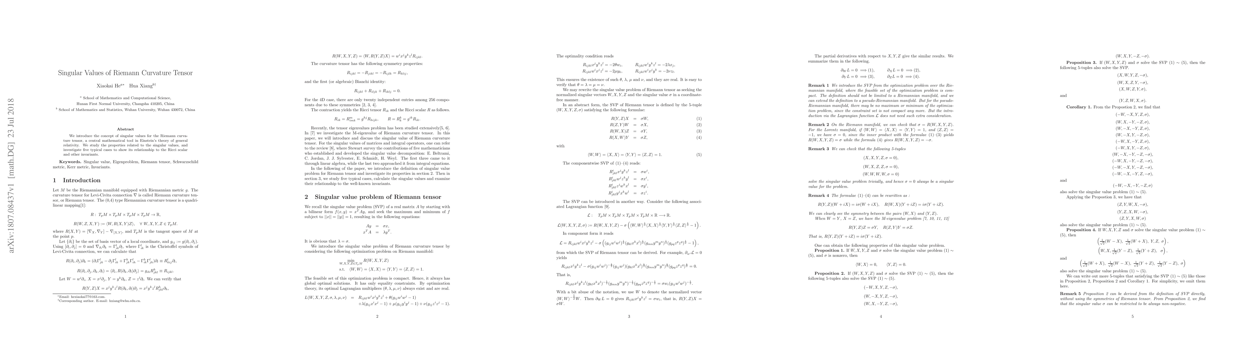 This paper introduces the concept of singular values for the Riemann curvature tensor, exploring their properties and relationships to the Ricci scalar and other invariants. It examines five typical cases to demonstrate these connections in the context of general relativity.