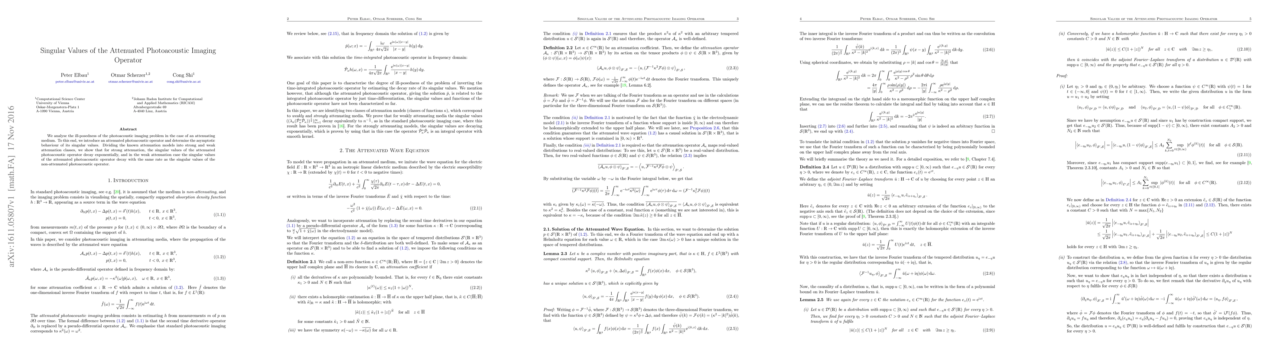 Researchers analyzed the photoacoustic imaging problem with an attenuating medium, finding that strong attenuation causes singular values to decay exponentially, while weak attenuation leads to similar decay rates as non-attenuated imaging.