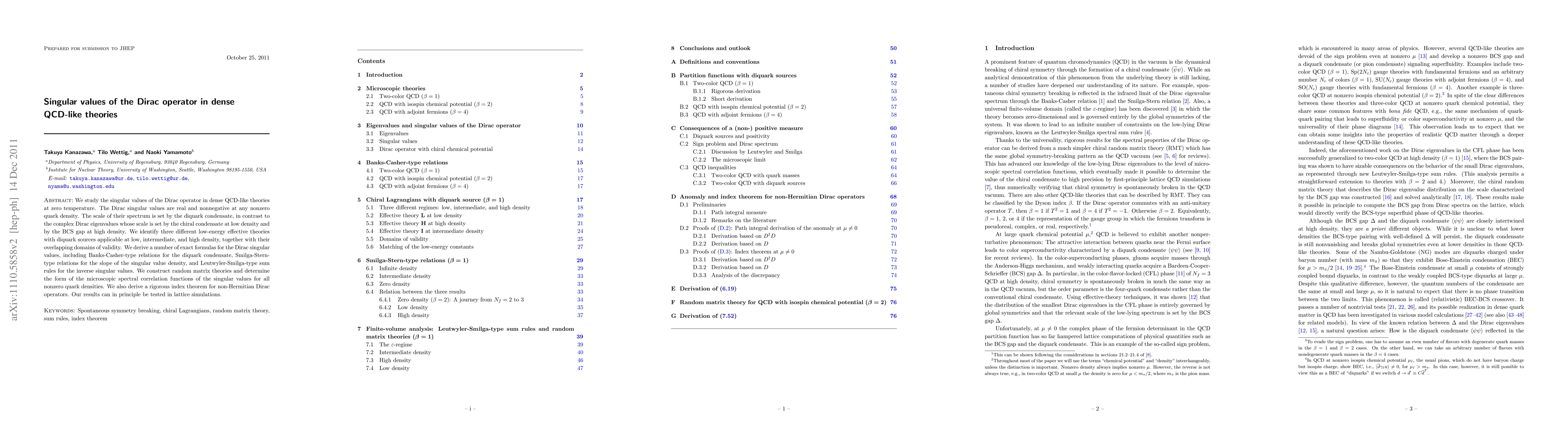 This paper investigates the singular values of the Dirac operator in dense QCD-like theories, revealing that they are real and nonnegative at any nonzero quark density, with their scale determined by the diquark condensate. The authors derive exact formulas and construct random matrix theories to analyze the spectral correlation functions and propose a rigorous index theorem for non-Hermitian Dirac operators, with results potentially testable in lattice simulations.