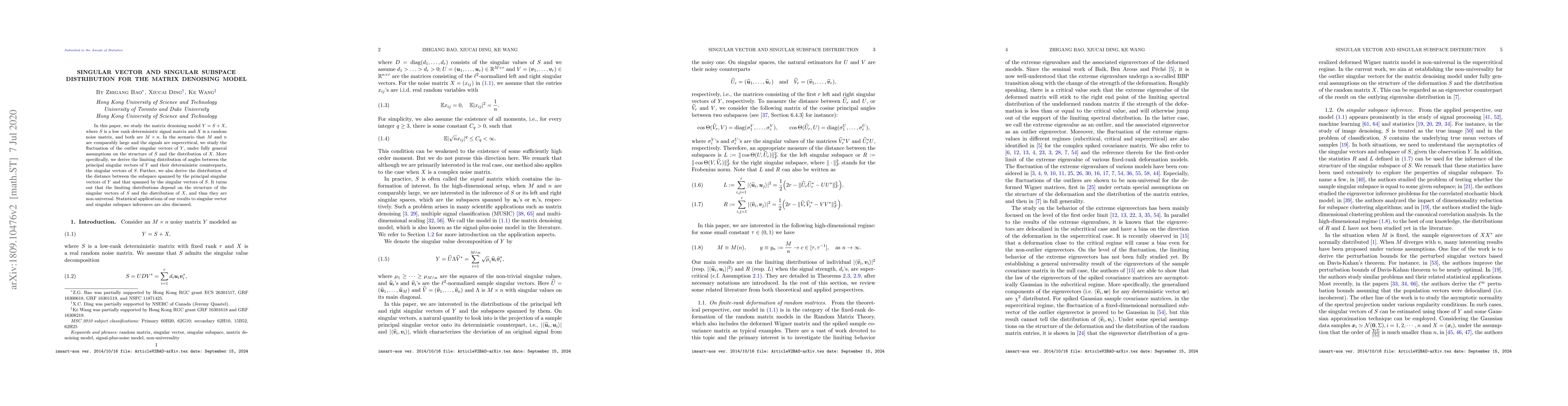 In this paper, we study the matrix denosing model $Y=S+X$, where $S$ is a low-rank deterministic signal matrix and $X$ is a random noise matrix, and both are $M\times n$. In the scenario that $M$ and $n$ are comparably large and the signals are supercritical, we study the fluctuation of the outlier singular vectors of $Y$. More specifically, we derive the limiting distribution of angles between the principal singular vectors of $Y$ and their deterministic counterparts, the singular vectors of $S$. Further, we also derive the distribution of the distance between the subspace spanned by the principal singular vectors of $Y$ and that spanned by the singular vectors of $S$. It turns out that the limiting distributions depend on the structure of the singular vectors of $S$ and the distribution of $X$, and thus they are non-universal.