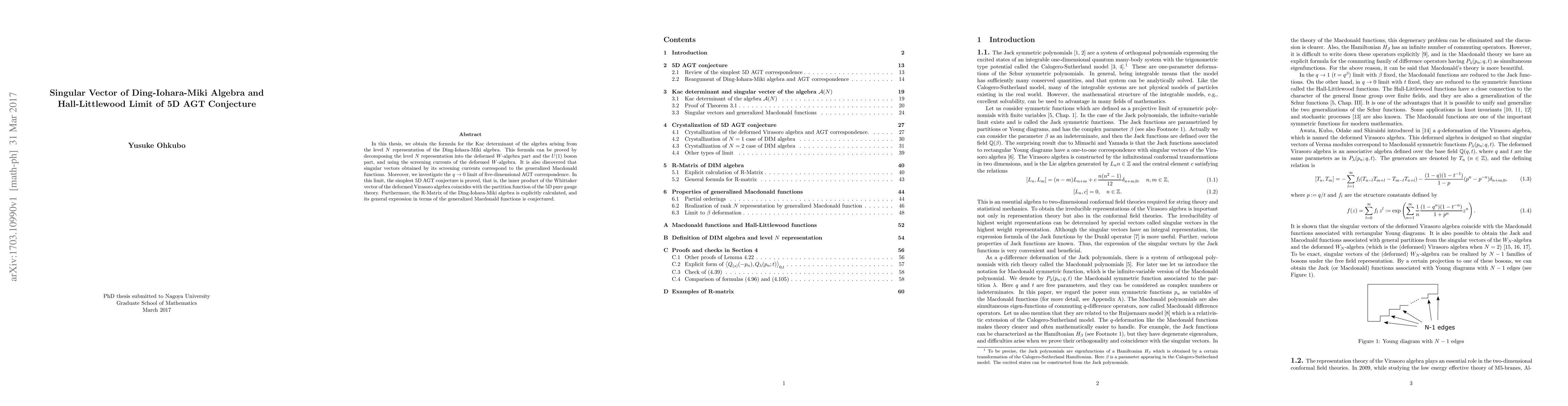 In this thesis, we obtain the formula for the Kac determinant of the algebra arising from the level $N$ representation of the Ding-Iohara-Miki algebra. This formula can be proved by decomposing the level $N$ representation into the deformed $W$-algebra part and the $U(1)$ boson part, and using the screening currents of the deformed $W$-algebra. It is also discovered that singular vectors obtained by its screening currents correspond to the generalized Macdonald functions. Moreover, we investigate the $q \rightarrow 0$ limit of five-dimensional AGT correspondence. In this limit, the simplest 5D AGT conjecture is proved, that is, the inner product of the Whittaker vector of the deformed Virasoro algebra coincides with the partition function of the 5D pure gauge theory. Furthermore, the R-Matrix of the Ding-Iohara-Miki algebra is explicitly calculated, and its general expression in terms of the generalized Macdonald functions is conjectured.