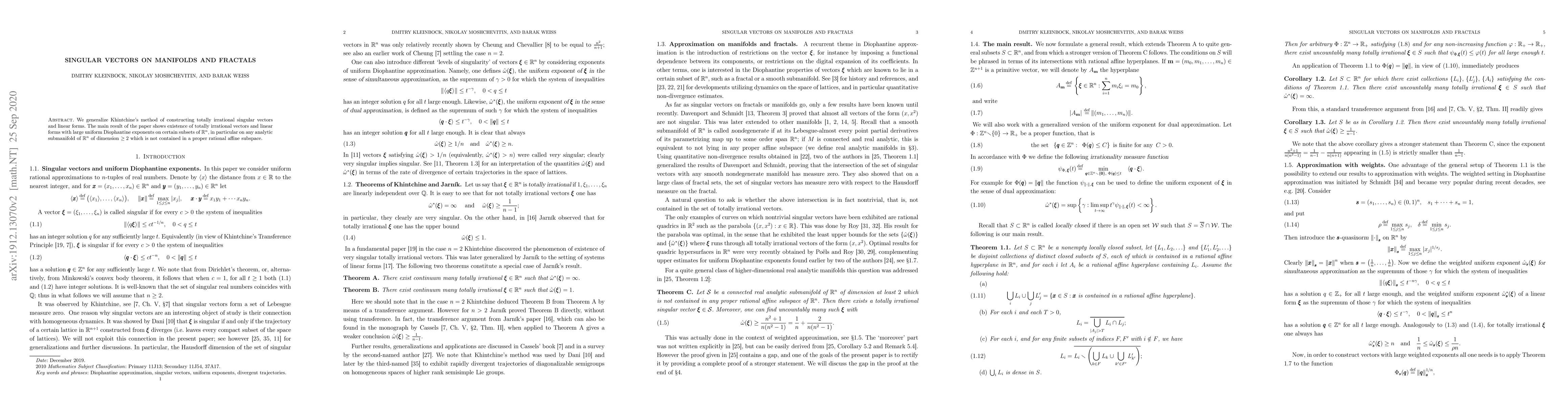 We generalize Khintchine's method of constructing totally irrational singular vectors and linear forms. The main result of the paper shows existence of totally irrational vectors and linear forms with large uniform Diophantine exponents on certain subsets of $\mathbb{R}^n$, in particular on any analytic submanifold of $\mathbb{R}^n$ of dimension $\ge 2$ which is not contained in a proper rational affine subspace.