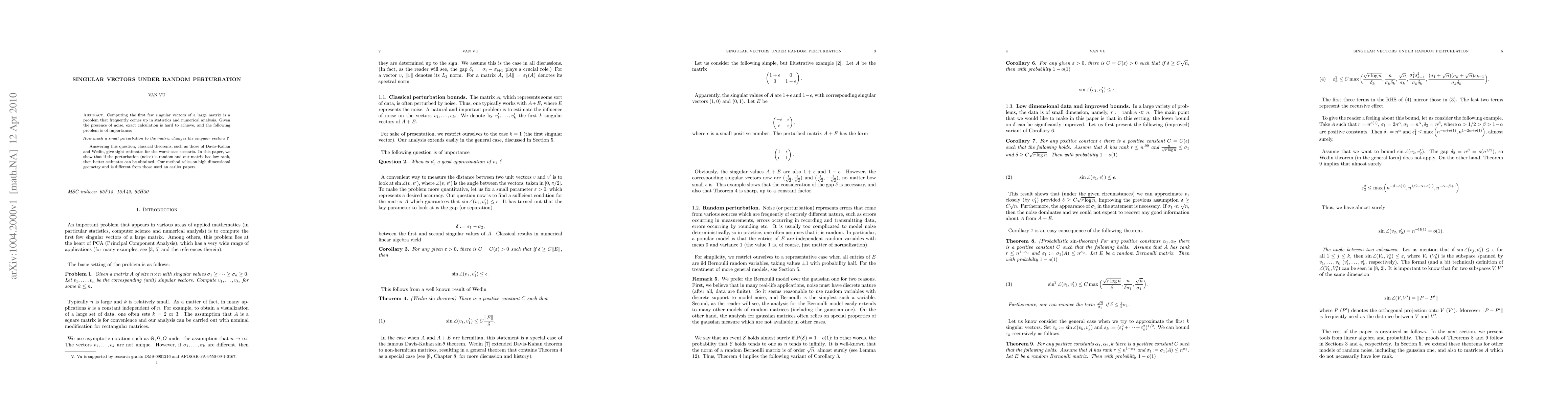 Computing the first few singular vectors of a large matrix is a problem that frequently comes up in statistics and numerical analysis. Given the presence of noise, exact calculation is hard to achieve, and the following problem is of importance: \vskip2mm \centerline {\it How much a small perturbation to the matrix changes the singular vectors ?} \vskip2mm Answering this question, classical theorems, such as those of Davis-Kahan and Wedin, give tight estimates for the worst-case scenario. In this paper, we show that if the perturbation (noise) is random and our matrix has low rank, then better estimates can be obtained. Our method relies on high dimensional geometry and is different from those used an earlier papers.
