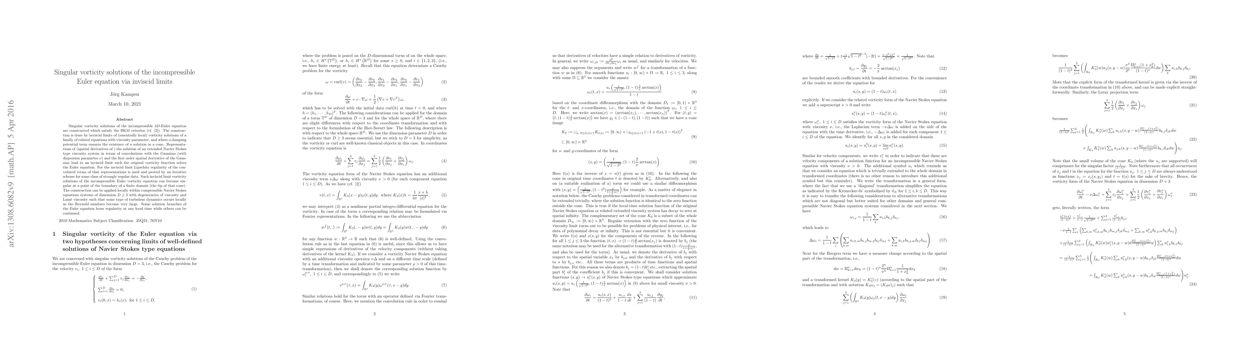 Singular vorticty solutions of the incompressible 3D-Euler equation are constructed which satisfy the BKM criterion (cf. [2]). The construction is done by inviscid limits of vorticity solutions of transformed incompressible Navier Stokes type equations with a damping potential term, where the latter equations admit a global regular solution for positive viscosity. The inviscid limit vorticity solution of the incompressible Euler vorticity equation becomes singular at a point of the boundary of a finite domain.