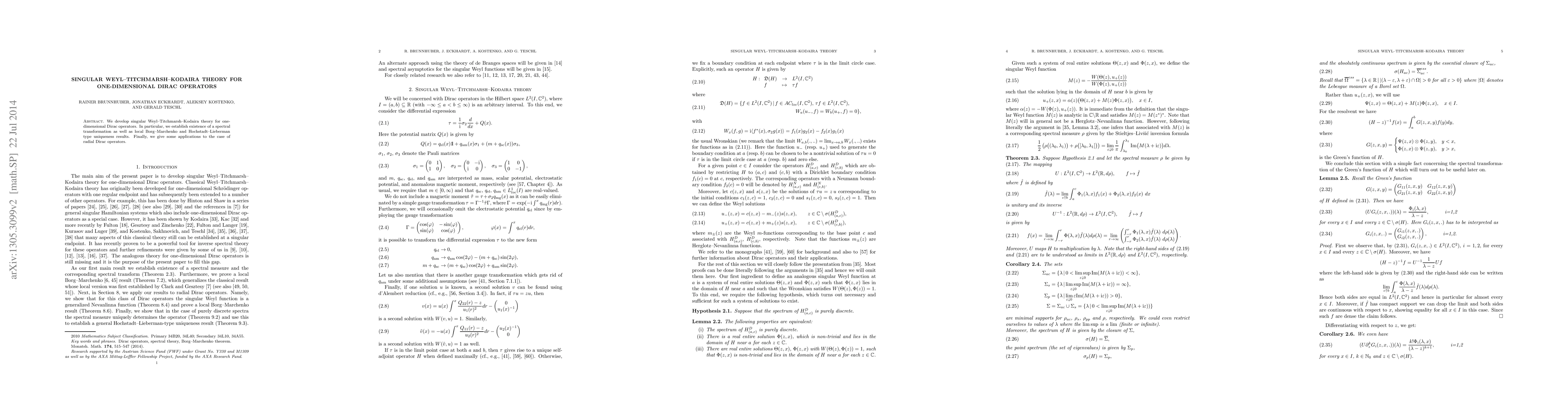This paper develops a singular Weyl-Titchmarsh-Kodaira theory for one-dimensional Dirac operators, establishing the existence of a spectral transformation and proving local uniqueness results akin to Borg-Marchenko and Hochstadt-Liebermann. Applications to radial Dirac operators are also discussed.