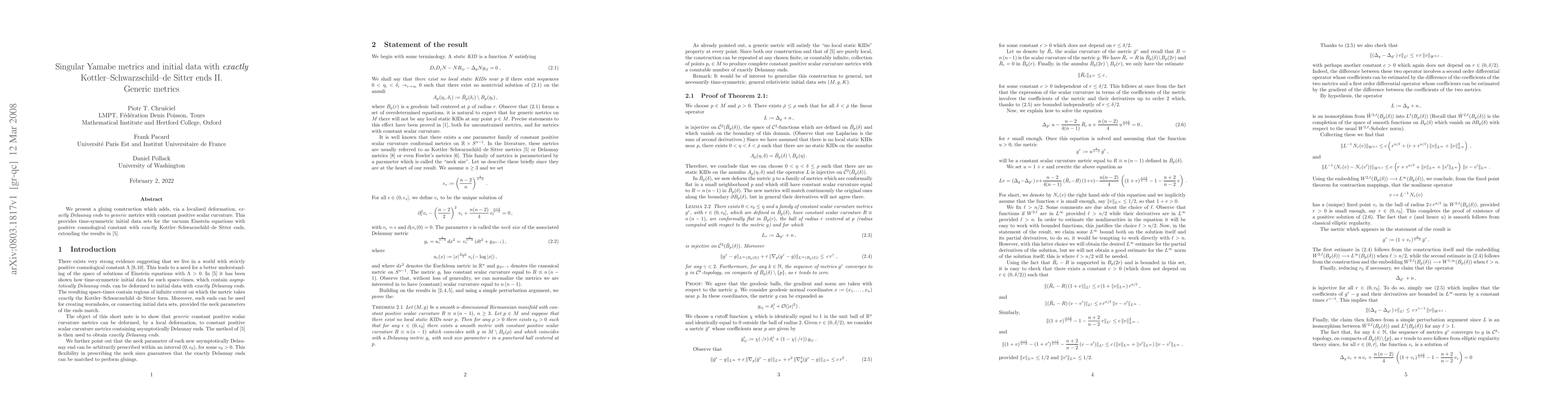 We present a gluing construction which adds, via a localized deformation, exactly Delaunay ends to generic metrics with constant positive scalar curvature. This provides time-symmetric initial data sets for the vacuum Einstein equations with positive cosmological constant with exactly Kottler-Schwarzschild-de Sitter ends, extending the results in arXiv:0710.3365 [gr-qc].