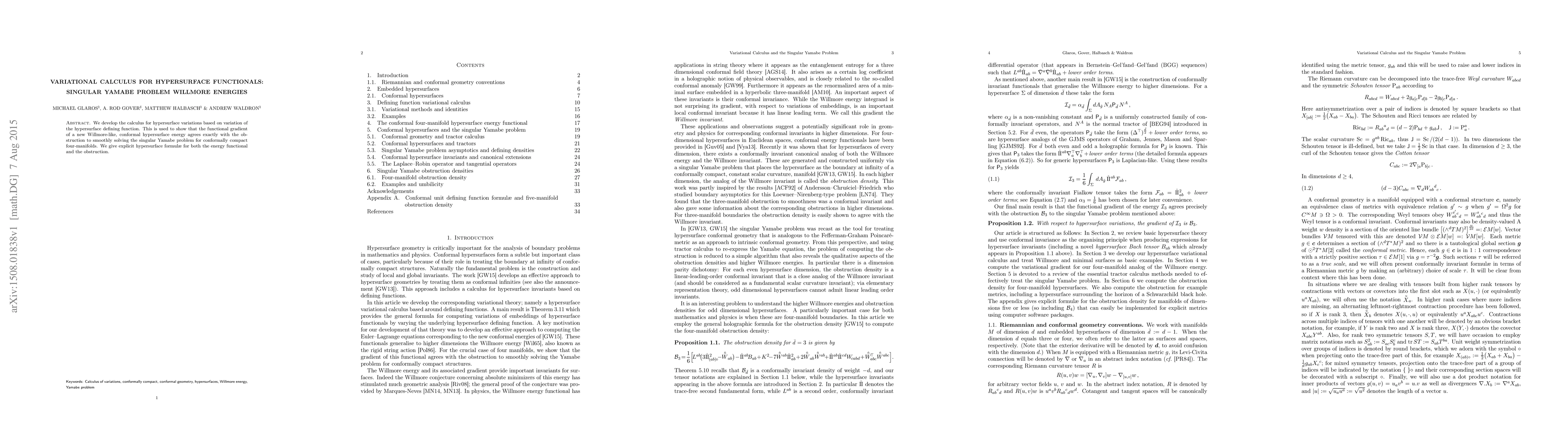 This research paper introduces a novel calculus for hypersurface variations, utilizing the variation of a defining function. It demonstrates that the gradient of a new Willmore-like, conformal hypersurface energy corresponds precisely with the obstacle to resolving the singular Yamabe problem smoothly in conformally compact four-manifolds. The paper also provides explicit formulae for the energy functional and the obstruction.